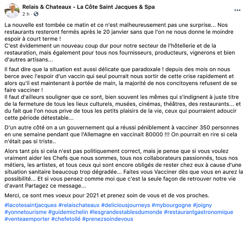 Le chef JM Lorrain à diffusé ce message sur son compte Facebook :