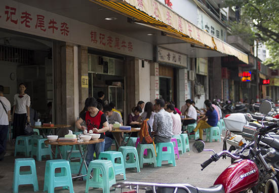 Les bols arrivent enfin sur notre table, garnis de céleri chinois, de ciboule et de galanga râpé dont les parfums se mêlent à la bonne odeur de bœuf. Une coupelle de condiment char sha et une autre de sauce pimentée accompagnent l’ensemble. On a faim, on se brûle la gueule malgré les 31 degrés ambiants. Les gens de Chaozhou mangent très chaud et boivent leur thé bouillant. Pour faire le thé, ils saisissent à mains nues la porcelaine brûlante. Après examen, je crois que c’est parce qu’ils ont toujours faim et toujours envie de boire du thé. Comme ils ne peuvent pas attendre, ils sont devenus insensibles à la chaleur.