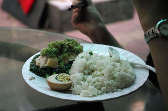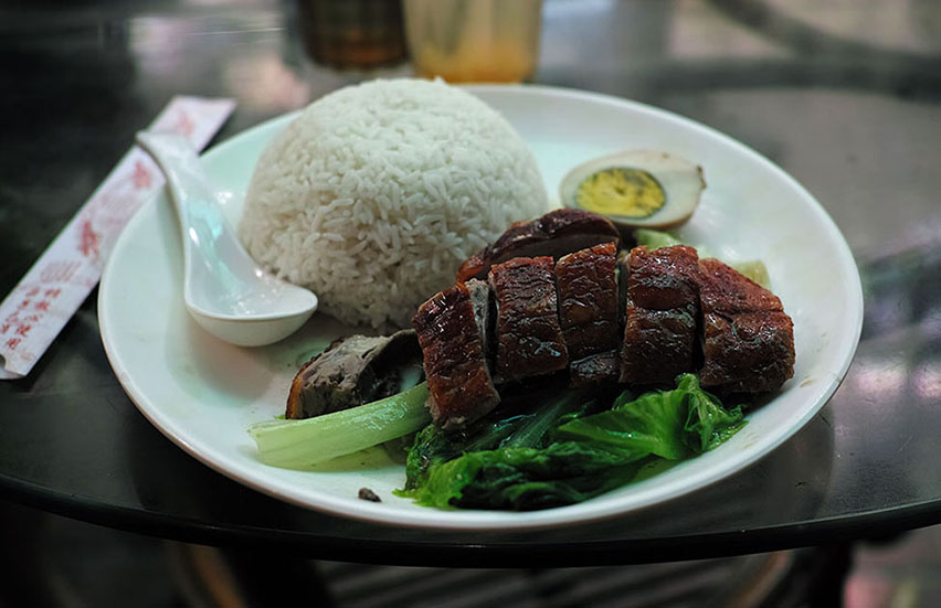 Notre oie était nickel. Nous l’avons commandée avec du riz au lieu de nouilles (siu e fan). Le plat est tout simple : du riz, de l’oie, un demi-œuf dur cuit dans le jus de l’oie et quelques feuilles de laitue sautée.