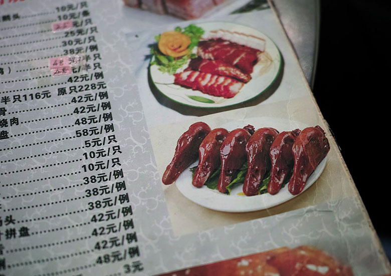Outre les oies rôties qu’il débite au quintal, y compris foies, têtes et côlons, le restaurant offre une carte assez courte de spécialités de Dongguan et du Sud cantonais (congee aux racines médicinales, soupe de wonton, char siu, lait double-peau (shuang pi nai), pudding tapioca-mangue, etc.) et une splendide sauce pimentée maison que l’on peut acheter en bocal.
