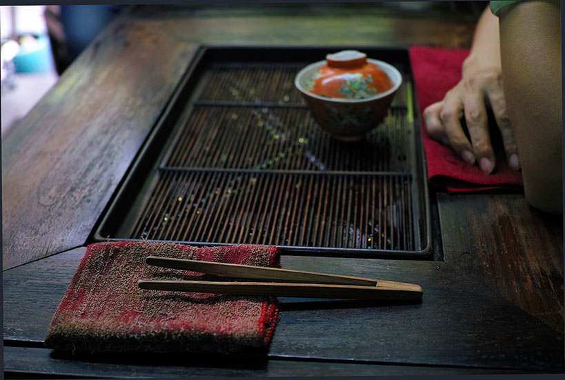 Après un tel festin, heureusement, la maison de thé n’est qu’à quelques pas. Pour faire passer tout ça, on va siroter un vieux pu-er bien costaud, le genre qui fait pousser les poils, suivi d’un oolong ‘cannelle’ rou gui des monts Wuyi.