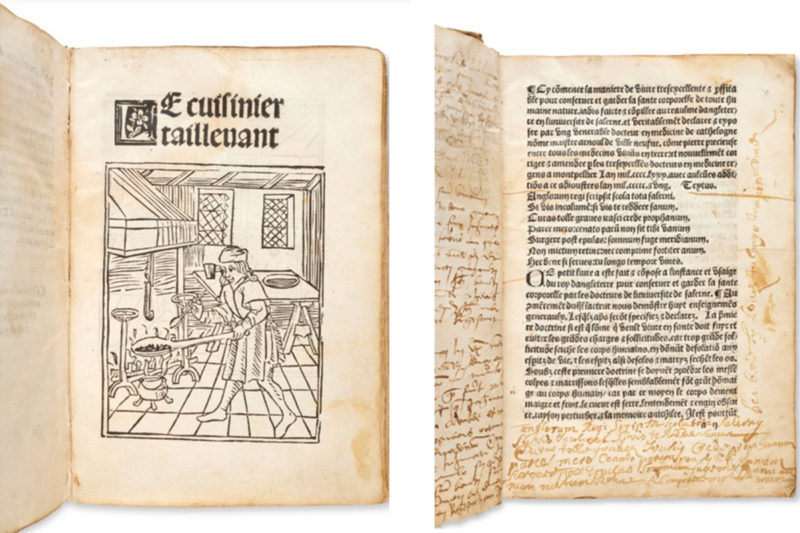 Le catalogue de cette vente exceptionnelle comporte une collection de livres anciens gastronomie, concurrents du « Viandier », signés Carême, La Varenne ou Escoffier, on y trouve un exemplaire du Livre fort excellent de cuysine de 1542, avec 350 recettes de la Renaissance, estimé entre 80 000 et 120 000 €. C’est l’un des livres de cuisine les plus influents de tous les temps, qui « atteste le renouveau décisif de la gastronomie à la Renaissance ». Le Platine en francoys est un concurrent du livre de Taillevent, écrit par l’Italien Bartolomeo Platina dans les années 1470. Cette traduction française de 1505, imprimée à Lyon, est estimée 60 000 à 80 000 €.