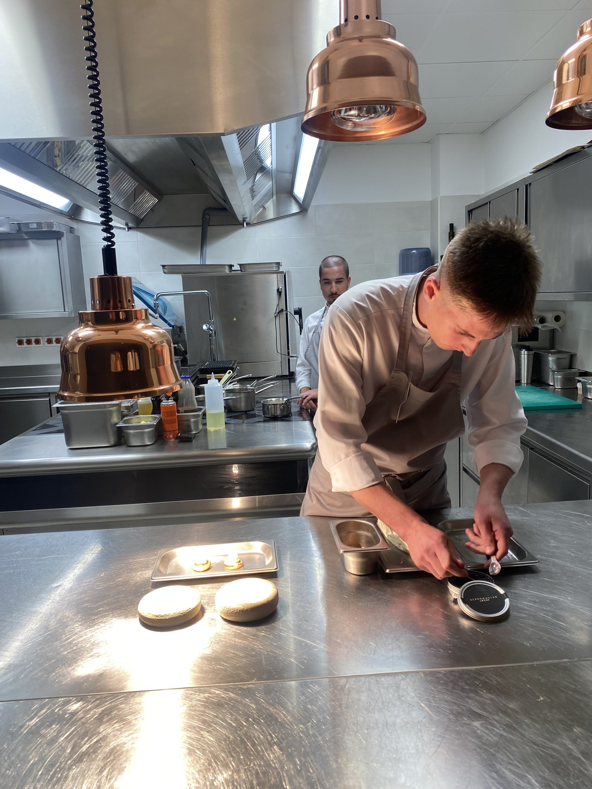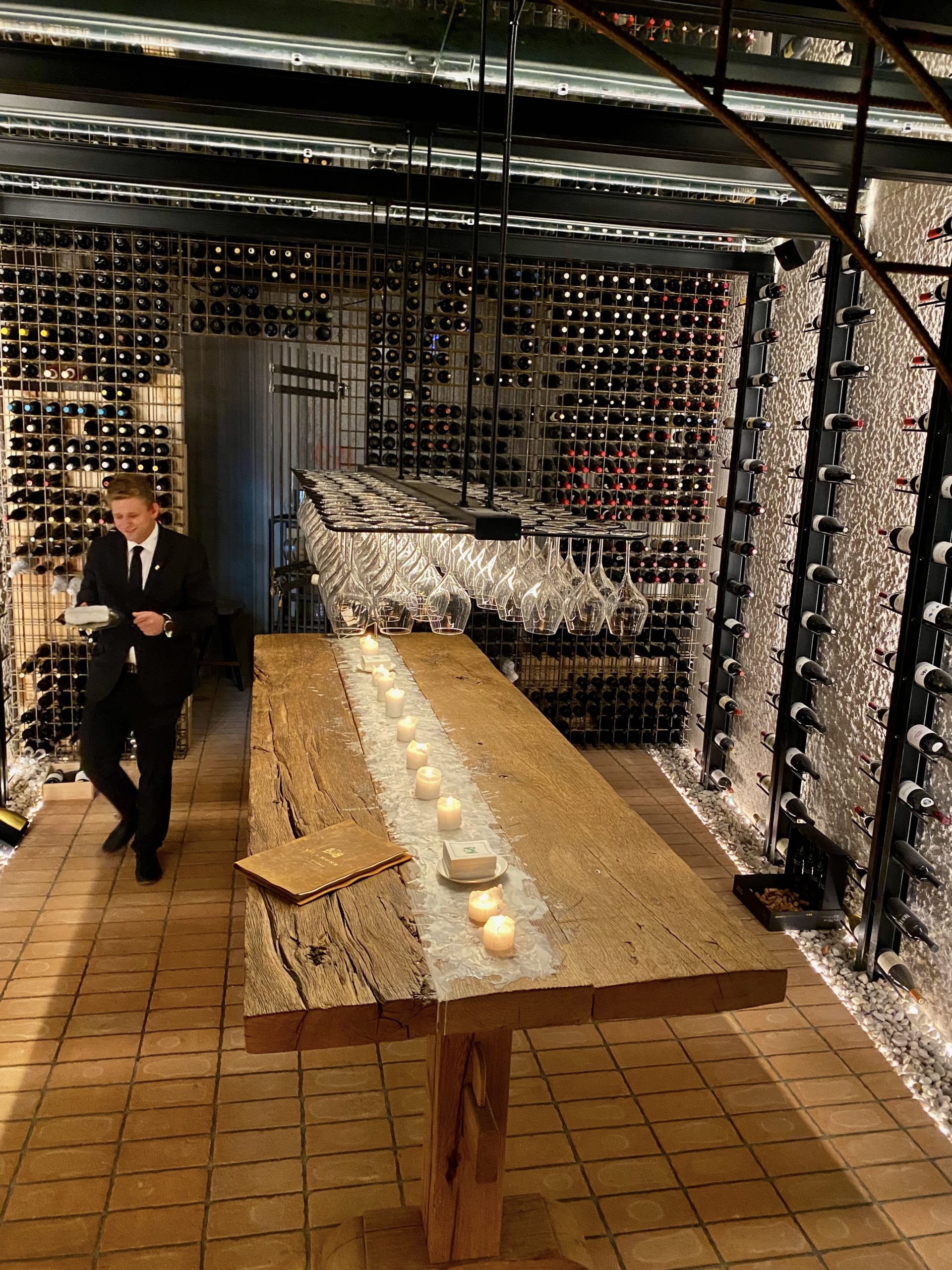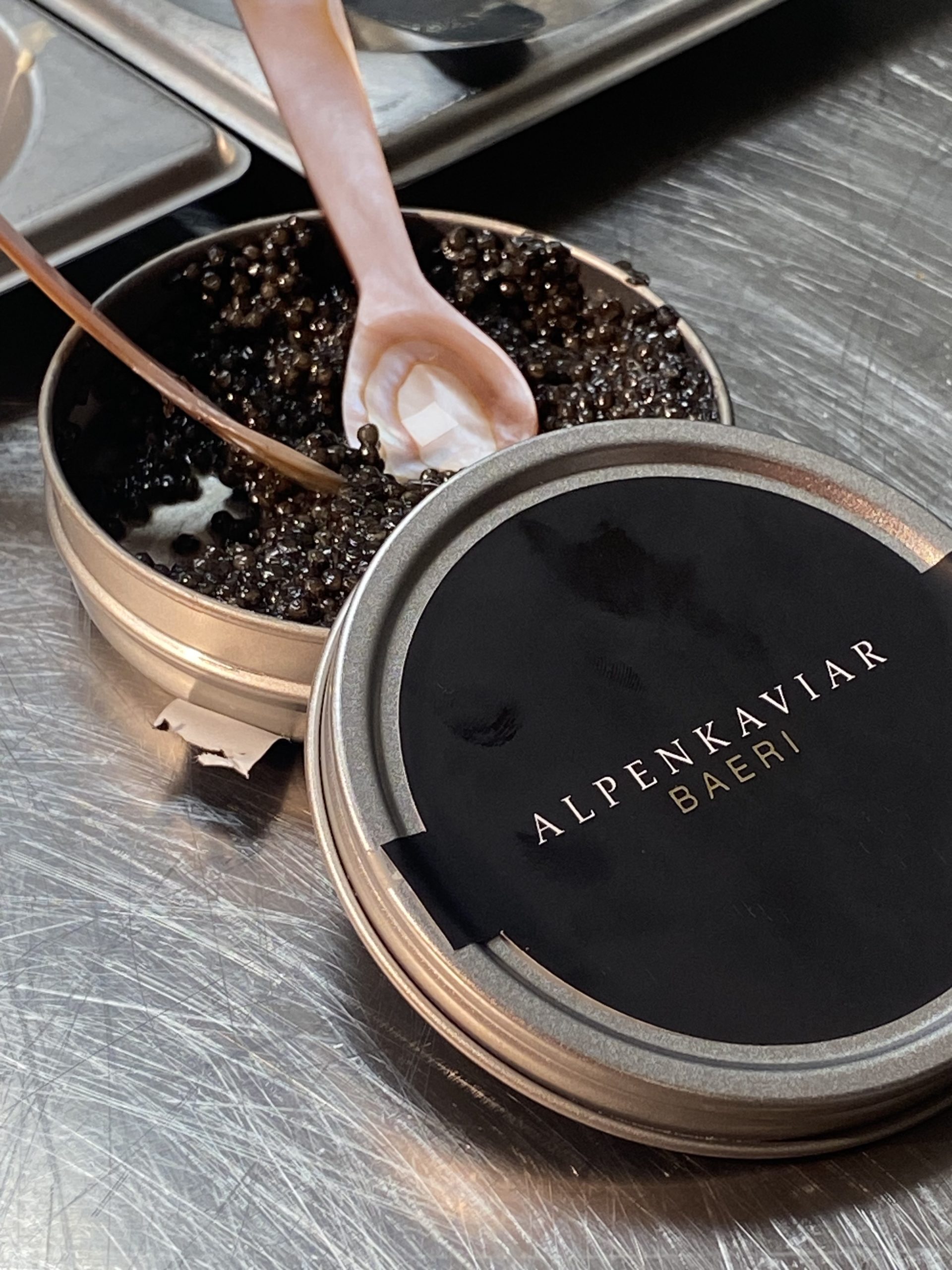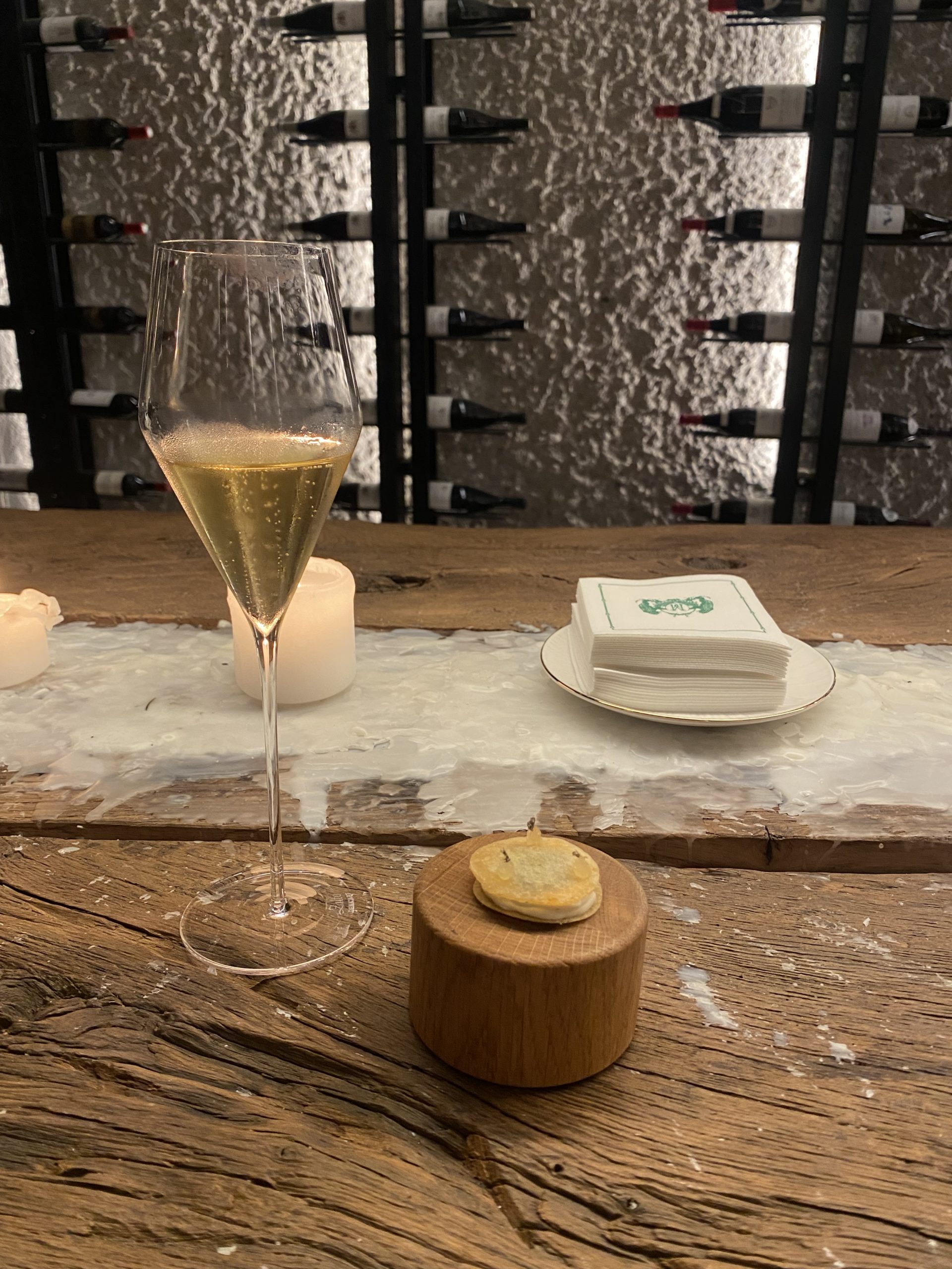 Avant de passer à table, nous sommes invitées par Nejc Jakopič, le jeune sommelier dont on dit de lui “qu’il change les règles du jeu de la sommellerie” à le rejoindre dans la cave qui est une véritable oeuvre d’art. Neijc nous explique qu’il n’est rien sans le chef et qu’aucune de ses sélections de vins n’est faite sans avoir dégusté en amont les plats … »C’est une complémentarité, un plat de viande, ses cuissons, les épices utilisées, s’associe à un vin plutôt qu’à un autre…tout mon travail est là, c’est ma passion et mes débuts dans le tourisme m’ont appris à échanger, à aimer partager avec les autres…” Egalement manager Food&Beverage de la Vila et de l’Hôtel Bohinj, Neijc est en train de devenir un des sommelier les plus côté de Slovénie ! Quelques dégustations de remarquables vins slovènes et nous passons à table, prêtes à apprécier les créations culinaires du chef Davor Arnautović. Un amoureux de la précision, du travail dans un circuit le plus court possible, dans une région où les produits locaux excellent. Il serait banal de parler de tradition revisitée de notes contemporaines, mais c’est comme cela que le chef entend faire vibrer les papilles des épicuriens qui viennent de plus en plus nombreux à sa table. Nous sommes au coeur des Alpes Juliennes et la montagne est une source d’inspiration. Les amuses bouches nous sont proposées en cuisine sous le signe de l’ Alpenkaviar.