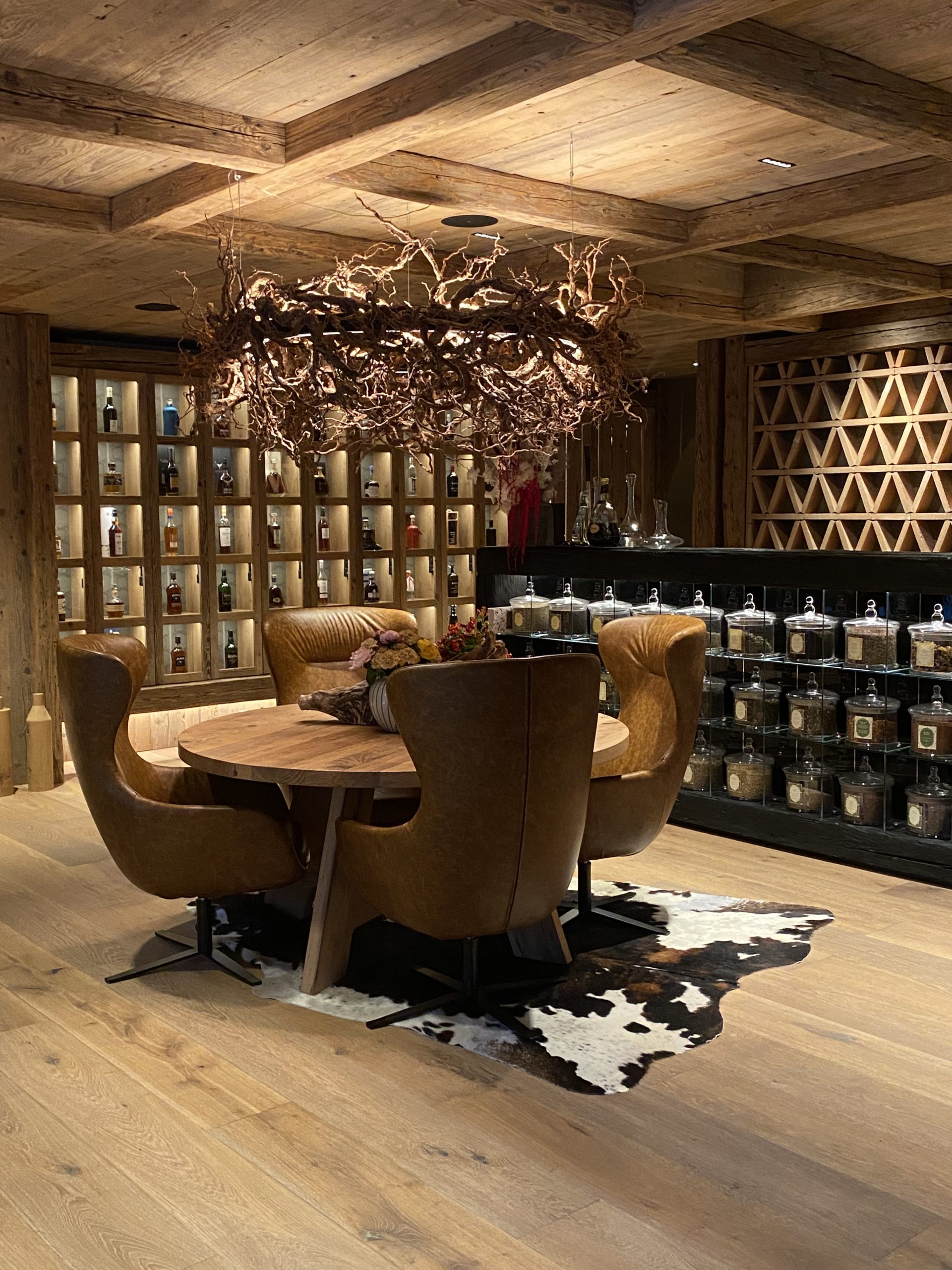 Diner à la Vila Muhr c’est avoir le privilège de tenter une expérience gastronomique des plus interessantes. Le cadre déjà est assez hallucinant : Le bois y règne en maitre créant une atmosphère toute en douceur au coin du feu d’une immense cheminée. Le lustre monumental est fait de racines de hêtre récupérées d’un arbre tombé au bord du lac .Le mobilier d’esprit année 60 affirme ces tonalités blondes et réconfortantes.