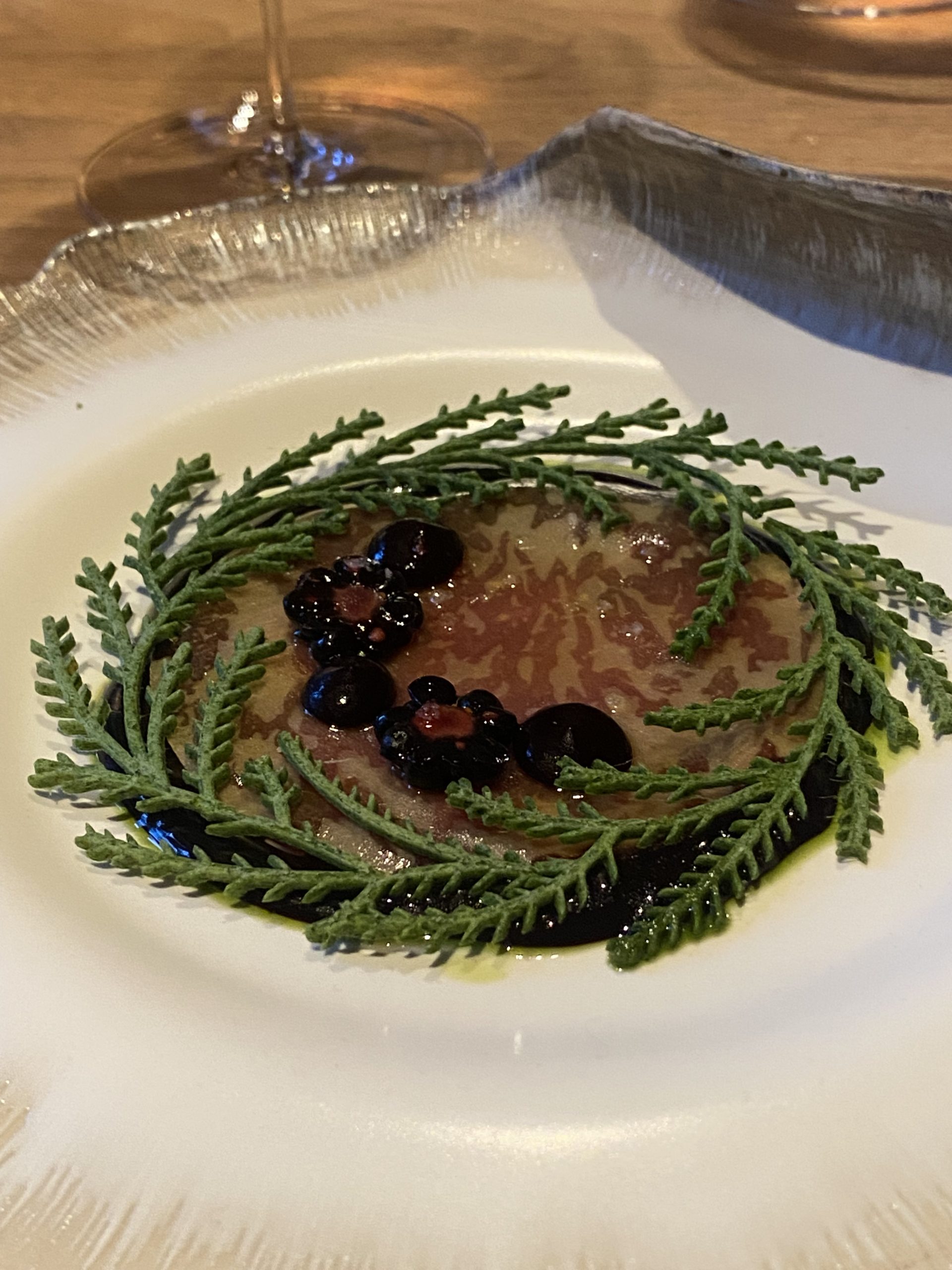 Carpaccio de cerf au chou-rave, vinaigre balsamique, mûres des bois.