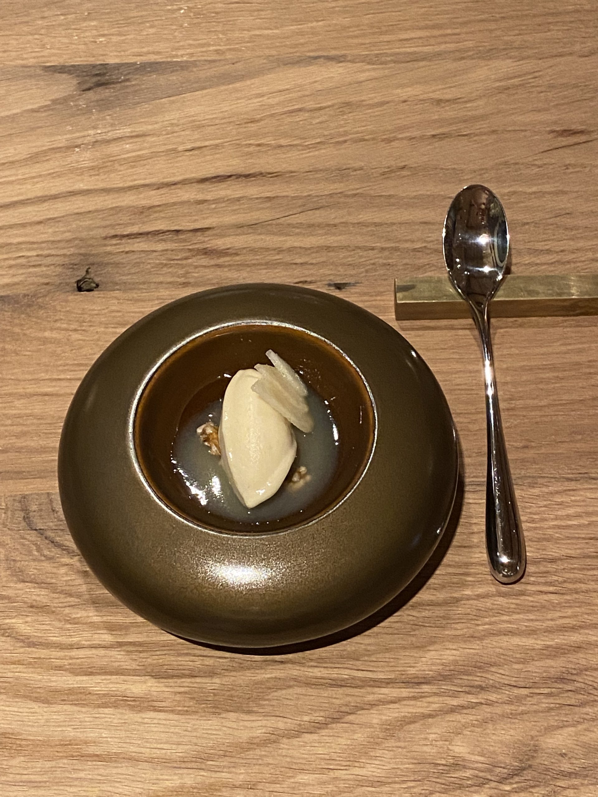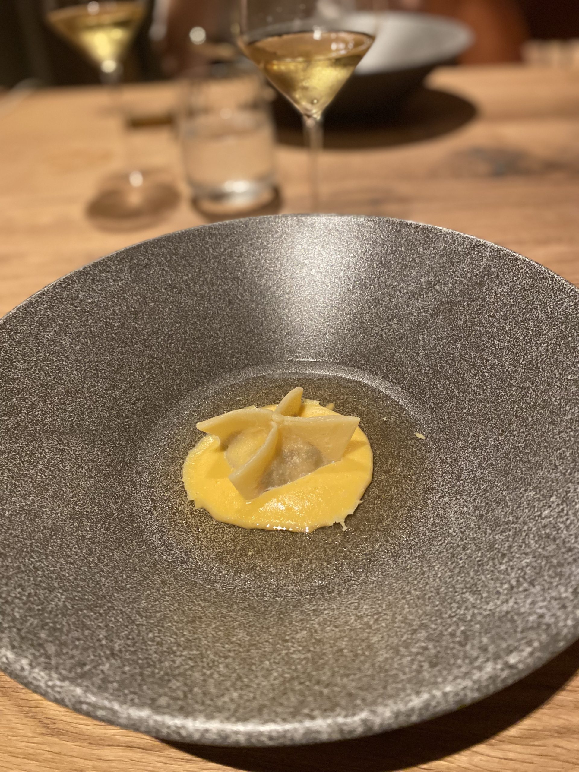 Raviolis farcis au sanglier, fromage de Bohinj sauce hollandaise, consommé.