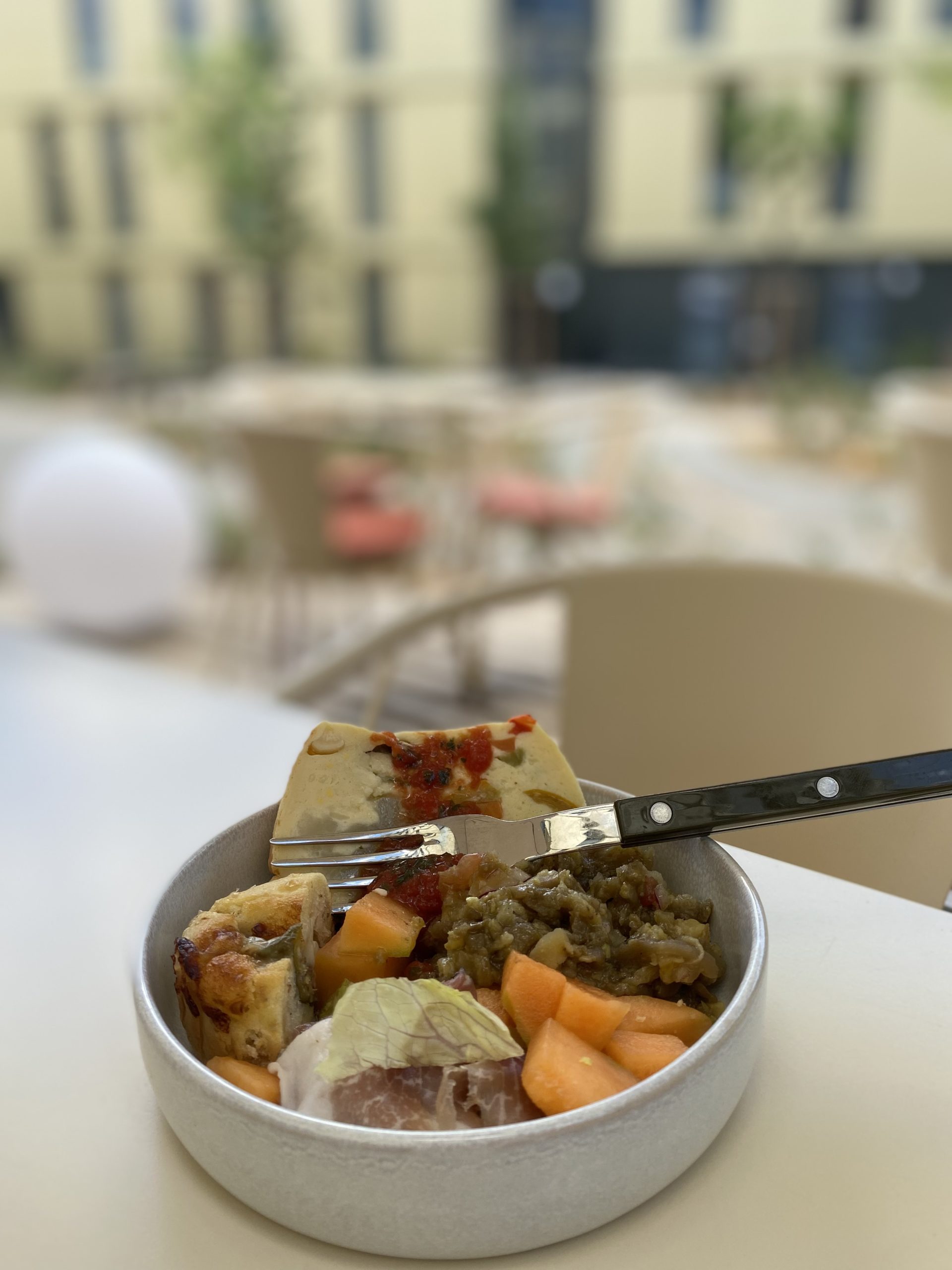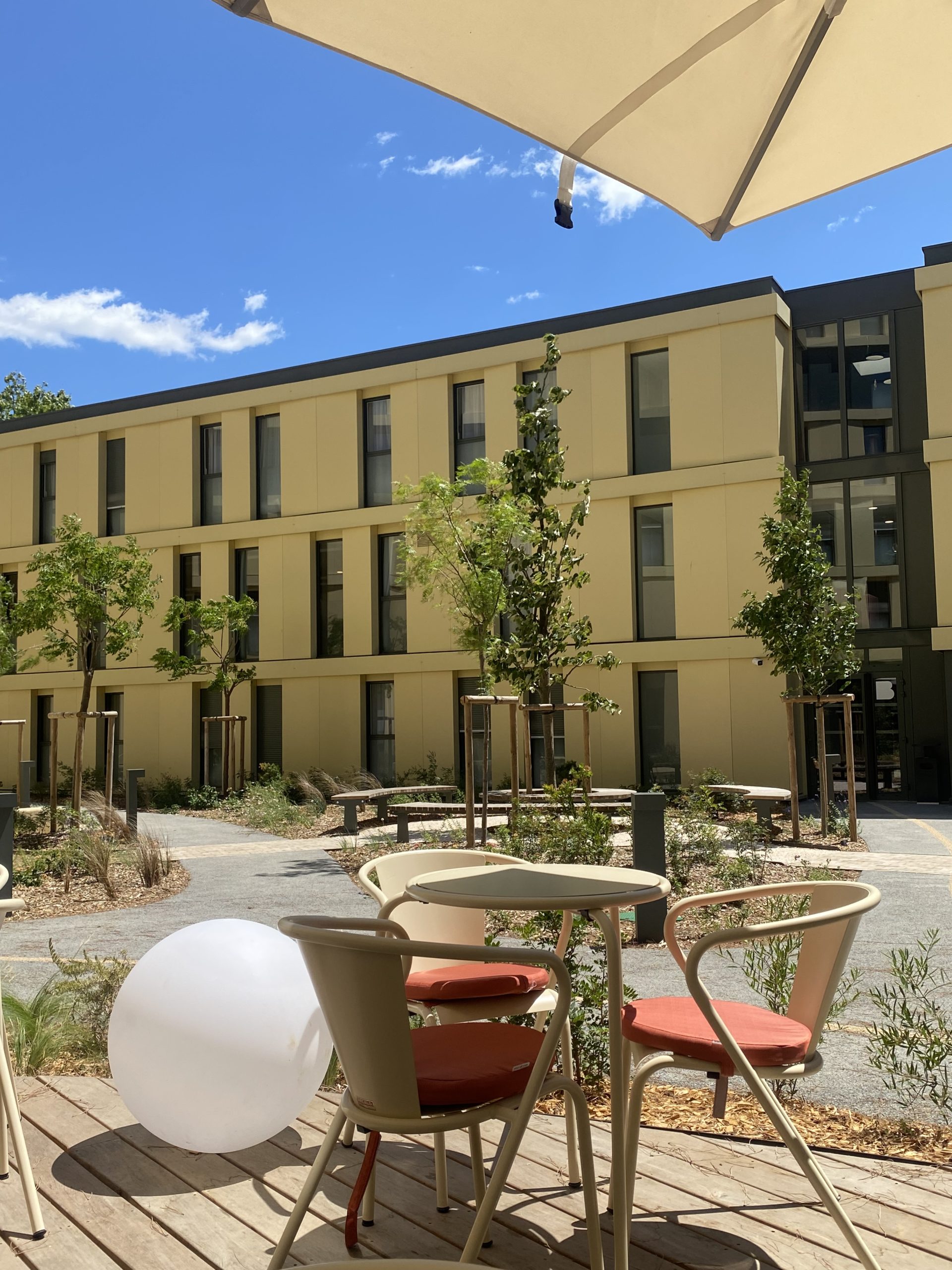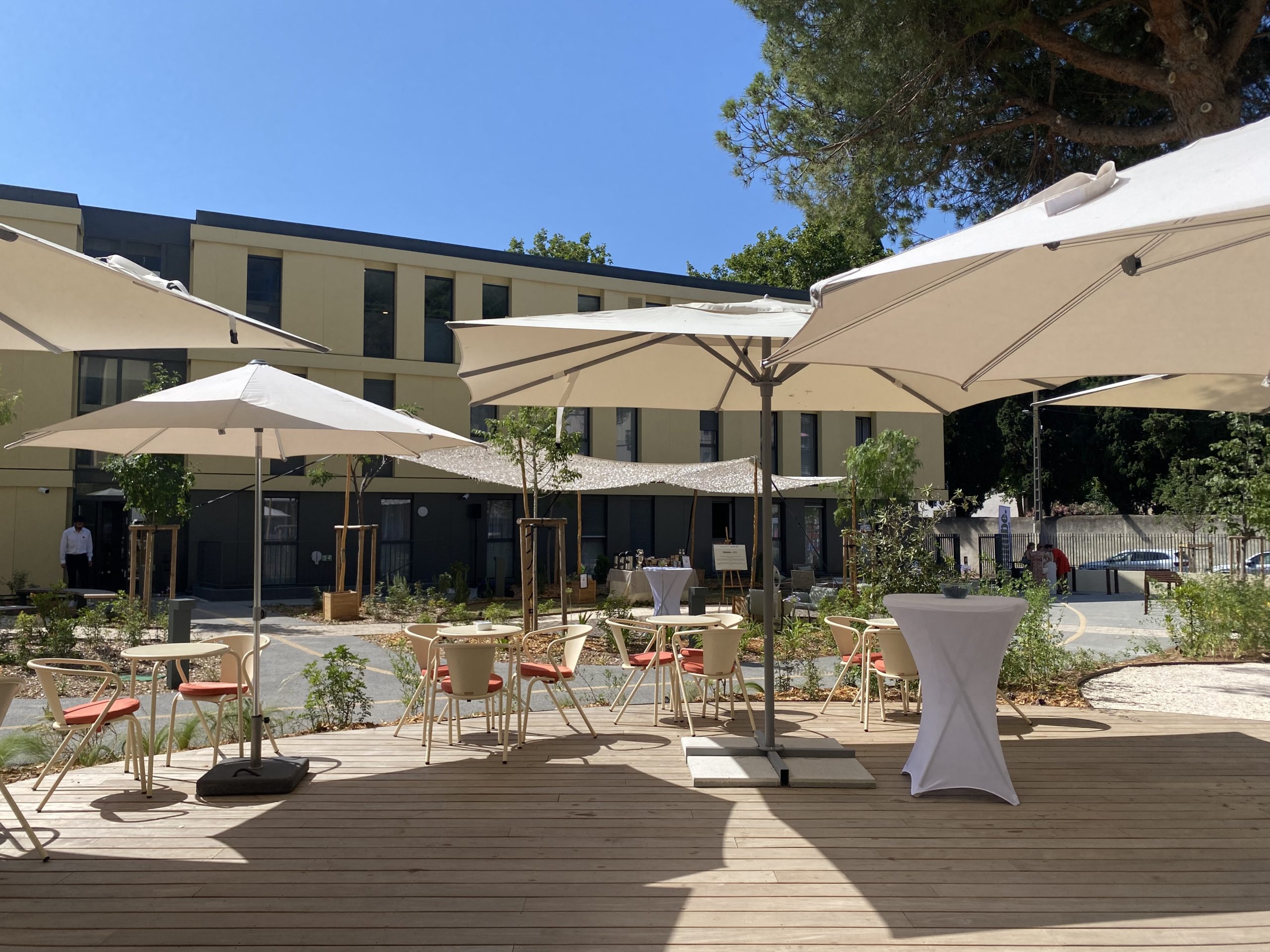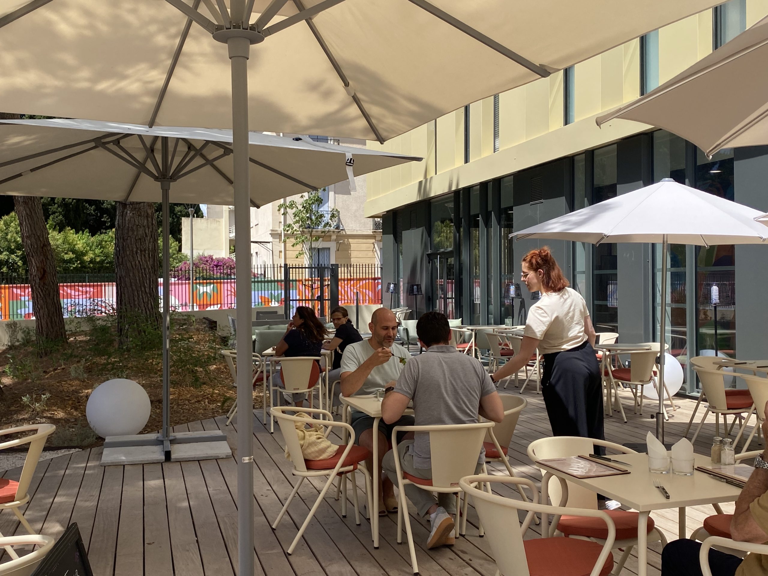 le restaurant se double d’une terrasse qui a pris place dans le jardin intérieur de la résidence dont les arbres devraient d’ici quelques années apporter ombre et fraicheur à ce tout nouveau lieu de vie.