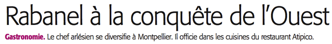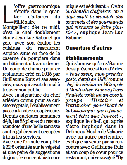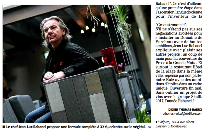 Page d'accueilMADE BY F&SChefs & Actualités Food & Sens dans Chefs & Actualités Jean-Luc Rabanel investit Montpellier C’est dans le cadre du quotidien Midi Libre que Didier Thomas Radux est allé à la rencontre du chef Arlésien Jean-Luc Rabanel qui vient de poser une partie de ses couteaux à Montpellier… Lire la suite : Les " Bib Gourmand " France 2017 ont été présentés hier par le guide Michelin, ils fêtent leurs 20 ans » Jean-Luc RabanelMidi Libre Laisser un commentaire Publication connexe Andorra Taste : Dîner de clôture au restaurant UNNIC ! C’est tout en haut du Casino d’Andorre la Vieille, dans le cadre magnifique du Restaurant… Zineb Hattab : Première chef Végan étoilée en Suisse – Interview par F&S Zina Hattab a récemment reçu le Mérite Culinaire Suisse. Ce prestigieux prix national reconnaît sa… Ferran Adrià : Andorra Taste Award 2025 Il était l’invité d’honneur de cette quatrième édition, Ferran Adrià, maître incontesté de la cuisine…