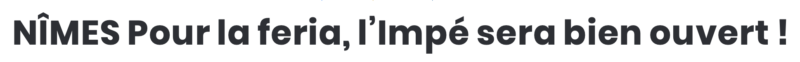 En dehors de la soirée du 5 juin, un peu privative, la feria à l’Impé se déroulera du 6 au 10 juin. Le côté festif débutera tous les soirs de feria à partir de 19h (jusqu’à 3h ou 4h du matin). Pour réserver une table appelez au 06.26.47.10.70.