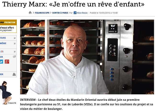 LES MÉDIAS – Thierry Marx est un des chefs les plus médiatiques du PAF, et un des plus demandés dans les médias. Il faut dire qu’il a fait un parcours sans faute dans l’émission Top Chef d’où il s’est retiré en 2014. Depuis on le retrouve très souvent à la télé notamment à Canal +, sont plus beau coup médiatique c’est lorsqu’il fut l’invité principal de » Vivement Dimanche » l’émission de Michel Drucker en décembre 2014, il fut ainsi propulsé dans les chefs bankable. Le 17 mai prochain il sera à la Une du – Parisien Économie –