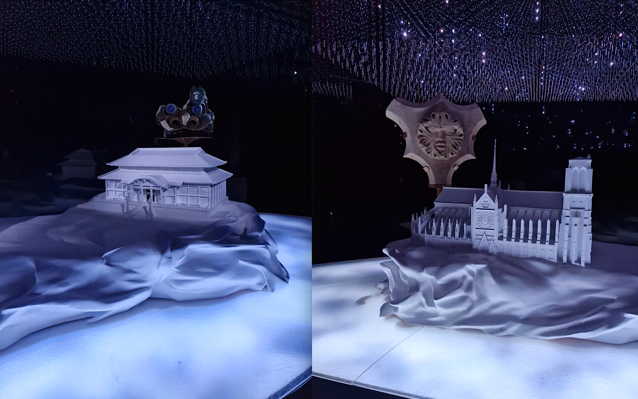 Nous voilà devant le Pavillon France qui attend 28 millions de visiteurs jusqu’à sa fermeture en octobre. Il se présente comme une célébration du patrimoine et de la culture. Une initiative de LVMH qui est généreusement présent sur les événements français, Jeux Olympiques, Reconstruction de Notre Dame, Pavillon France, Fondation Louis Vuitton.