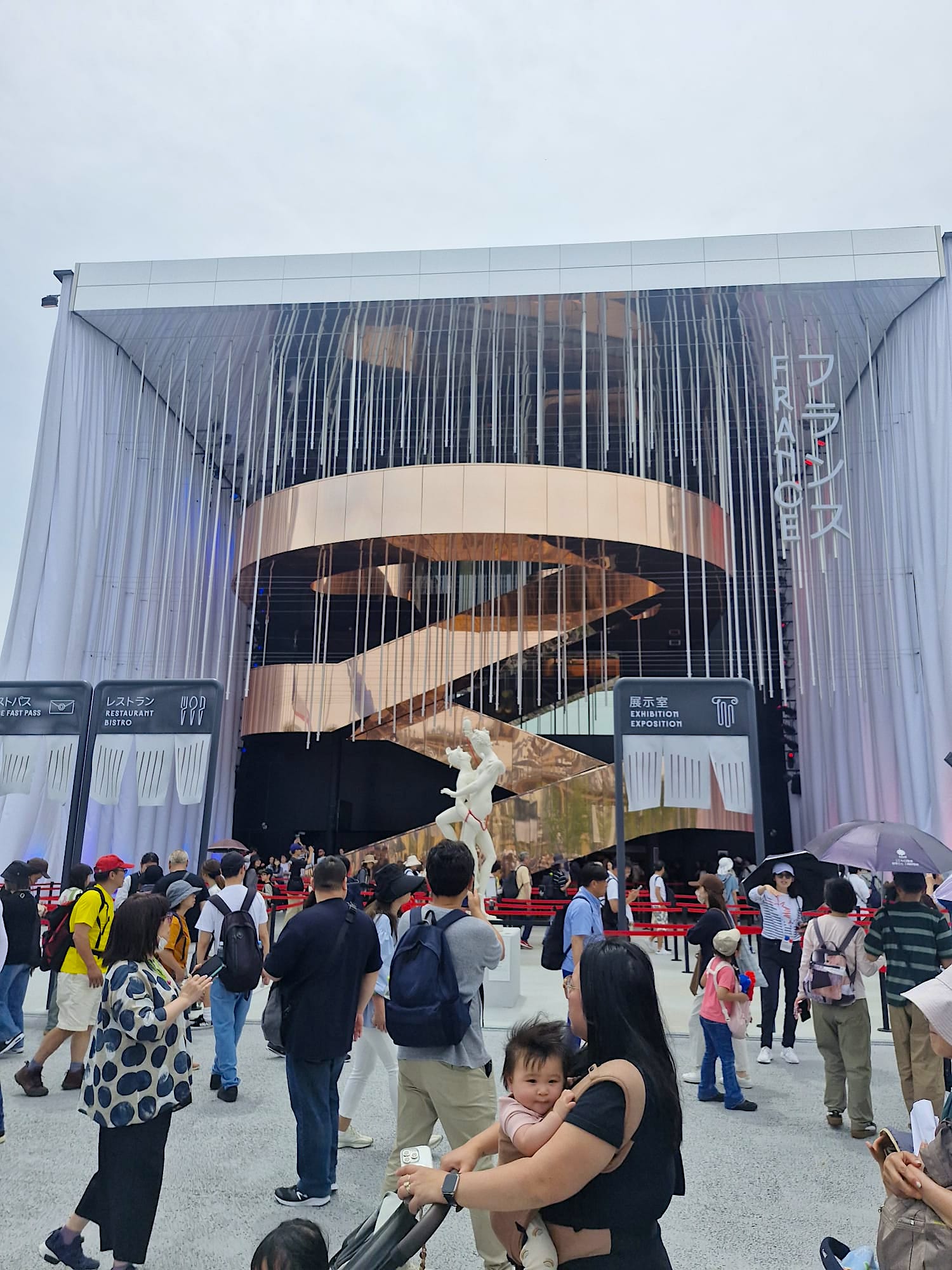 Suivez-nous dans la visite. Si vous êtes à Osaka, si vous n’êtes pas VIP, armez-vous de patience. Profitez des files d’attente pour regarder à 360° autour de vous, admirer, applaudir les audaces réussies, et les autres, qui transforment l’île en un parc de technologie avancée. Quand on arrive sur le site de l’expo, on sent monter une folle sensation, celle d’être au coeur d’une ville immense qui pourrait être un parc d’attractions du monde, un parc Futur Land, autour desquelles tournent des milliers de gens qui viennent d’ici et d’ailleurs. Des sacs à dos par milliers attendent patiemment sans essayer de doubler les autres – nous sommes au Japon – qui vont d’un pays à l’autre sans besoin de passeport. Comme dans la ville règne un curieux chaos architectural, les pavillons se suivent et ne se ressemblent pas, dans un dédale joyeux de représentations nationales.