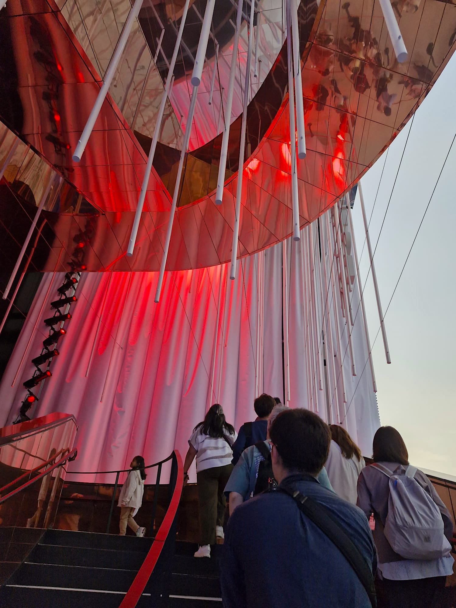 Nous traversons un cube tout blanc, bordé de grands voilages blancs. Le blanc en majesté. Il faut prendre un escalier tout doré pour découvrir l’intérieur du bâtiment, passer devant une boulangerie (qui n’a pas grand intérêt) , découvrir le nom des financiers du projet, rentrer dans des salles drapées de filaments de lumières de couleurs magnifiques qui se déploient sur toute la hauteur de l’espace.