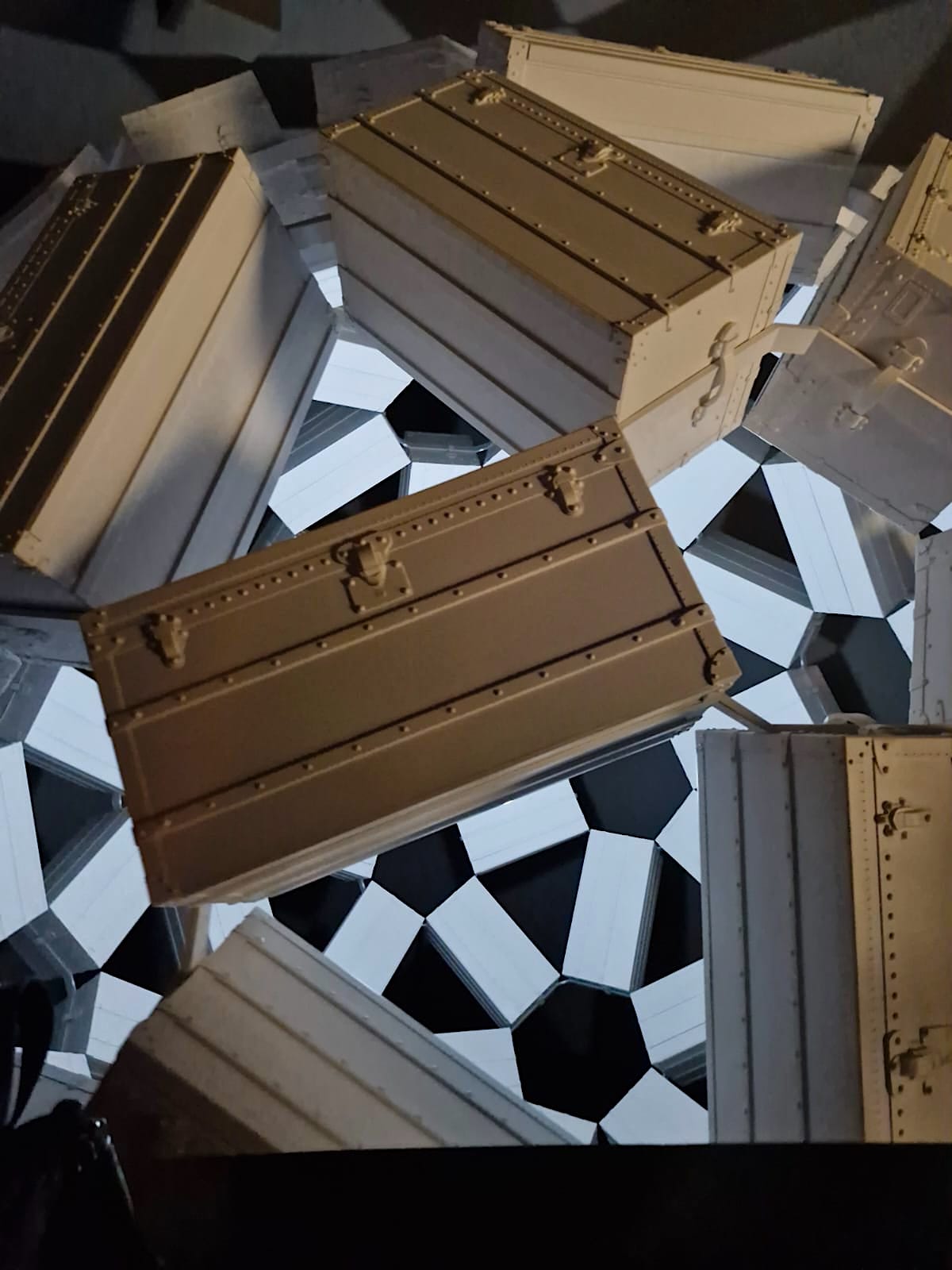 Première mise en scène par Louis Vuitton. Une promenade, une déambulation, une flânerie immersive dans le monde feutré, luxueux, élégant de Louis Vuitton. Nous voilà dans une des salles consacrées au mythique malletier. Les murs sont recouverts entièrement de malles Louis Vuitton ouvertes. 84 malles, empilées du sol au plafond. Elles contiennent des vidéos qui font découvrir le travail manuel des maroquiniers français, rendent hommage au geste de tous les acteurs de la maroquinerie, des artisans qui travaillent en artiste sur les produits d’exception. Depuis l’époque des voitures à chevaux, des paquebots transatlantiques, des trains de légende. La marque avec une stratégie marketing hors du commun met en scène la tradition des gestes, des petites mains des faiseurs de bagages, sacs, malles, valises…, avec la sobriété et l’élégance qui la caractérisent.