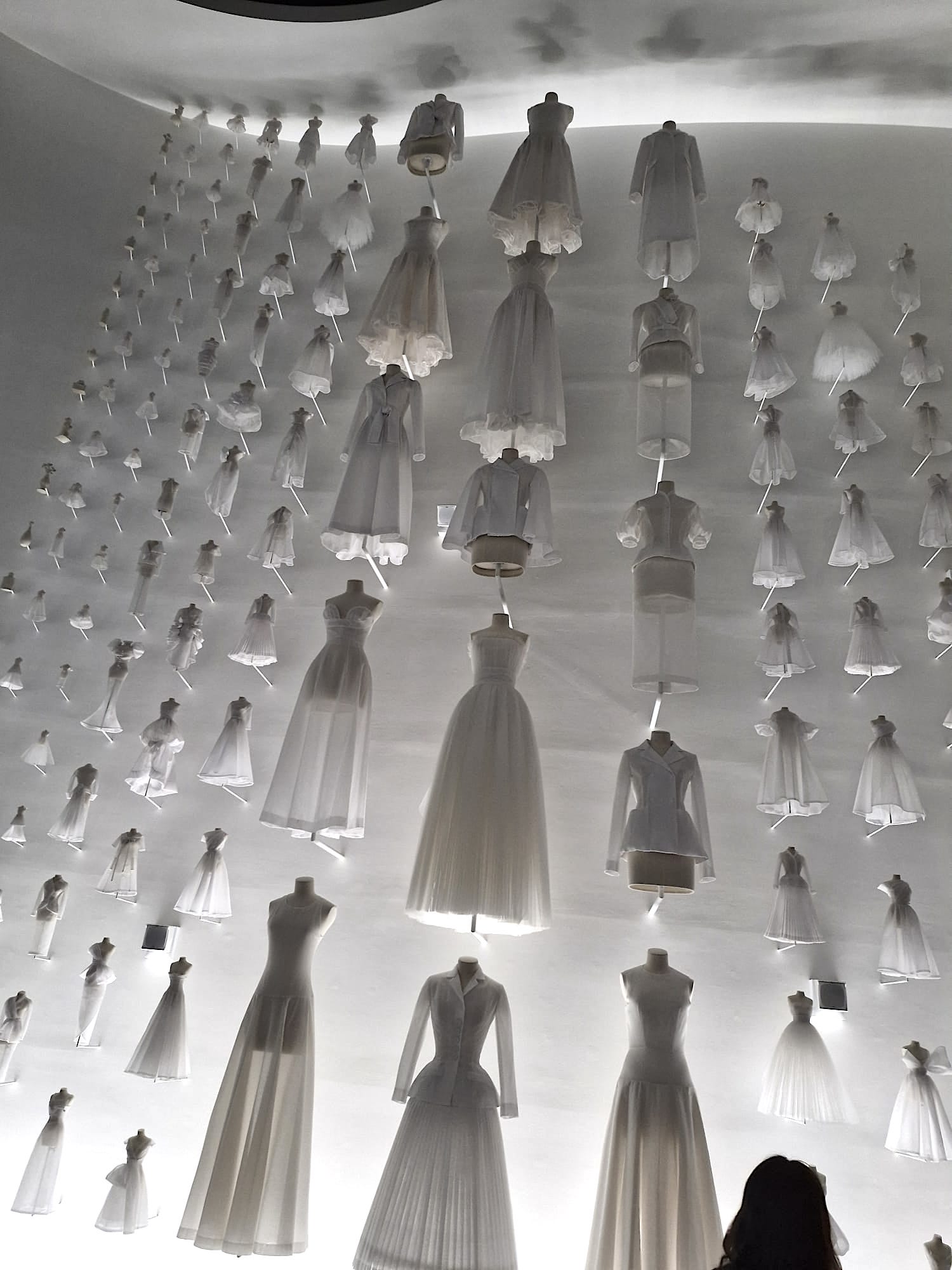 Les espaces suivant mettent en scène le monde du vin et place à la haute-couture. rencontres avec Coco Chanel, DIOR. Murs bancs sur lesquels dansent des robes blanches, comme à la boutique Dior, avenue Montaigne à Paris. Des sacs côtoient des flacons de parfum imprimés en 3D et un trio de costumes Bar de la marque, déclinés en bleu, blanc et rouge.
