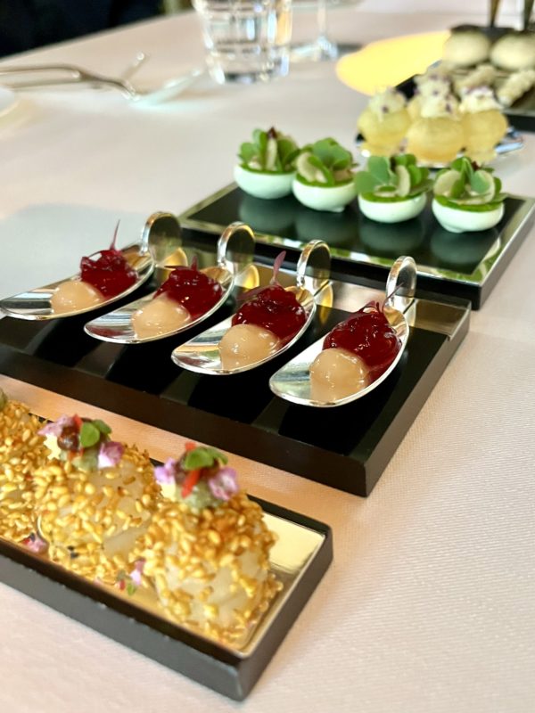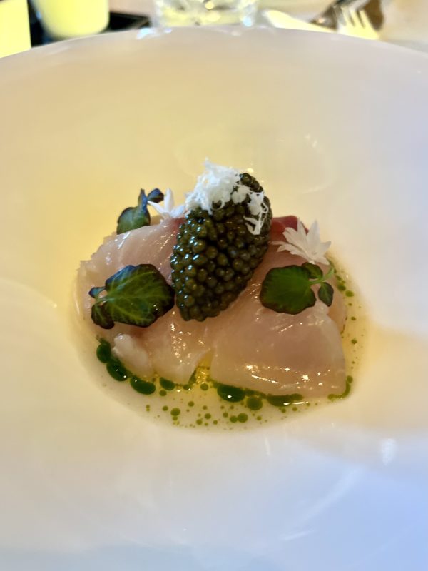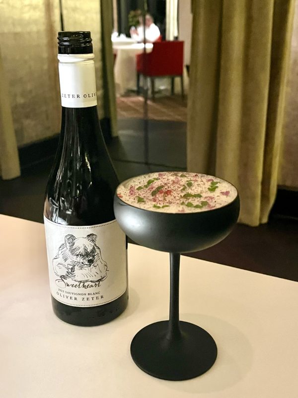 La soirée commence comme il se doit : avec une coupe de Krug qui accompagne les amuse-bouches. La maison de Champagne est partenaire officielle du Dolder Grand, et sa présence ici n’a rien d’anodin, bien au contraire, elle donne le ton avant même que le menu ne commence. La carte des vins, avec plus de 650 références, est d’ailleurs l’une des plus solides de Suisse. L’accent est mis sur la France et des millésimes qui remontent loin, et l’accord mets-vins est parfaitement exécuté.
