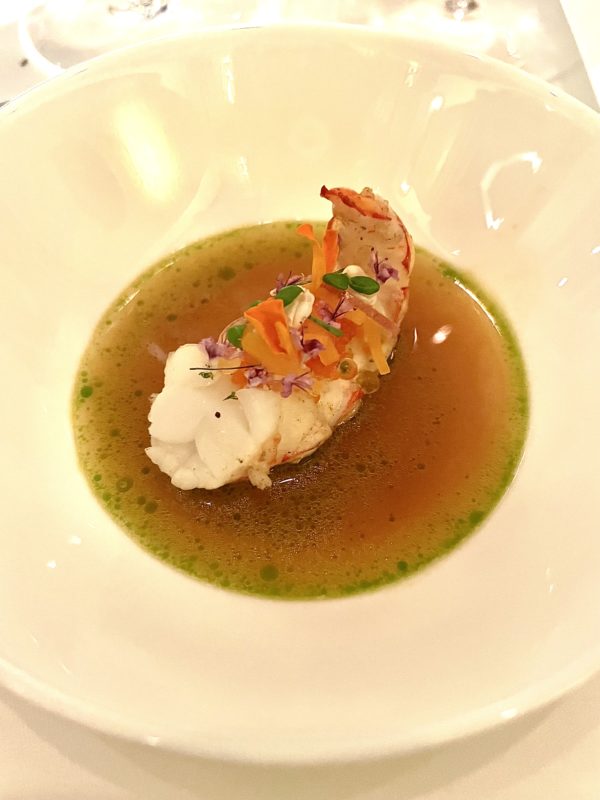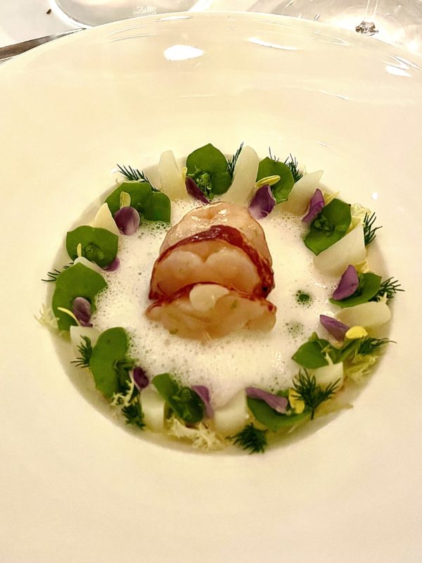 Le repas s’ouvre sur une sériole servie avec caviar, cresson, pomme et raifort, un premier acte précis qui cadre immédiatement le niveau de la soirée sans tout dévoiler. Suit une merluche au foie d’oie, relevée de yuzu et miso, puis l’un des plats signatures du chef : le homard de Bretagne, accompagné d’asperge blanche, lait de coco, vadouvan et aneth. C’est sans doute le moment le plus mémorable du menu, celui où la cuisine de Heiko Nieder exprime au mieux ce qu’elle sait faire. Le plat voyage entre les côtes bretonnes et l’Asie, sans que rien ne semble forcé ni artificiel, et son équilibre est remarquable. La langoustine aigre-piquante enchaîne avec une belle netteté, prolongeant cette ligne gustative précise avant d’ouvrir progressivement la voie aux registres plus enveloppants de la morille farcie au veau, petits pois, cerfeuil et noix, et du bœuf « BBQ » avec ail des ours, asperge verte et sauce mojo rouge, qui apportent quant à eux une note plus affirmée, presque directe, à l’ensemble du repas.