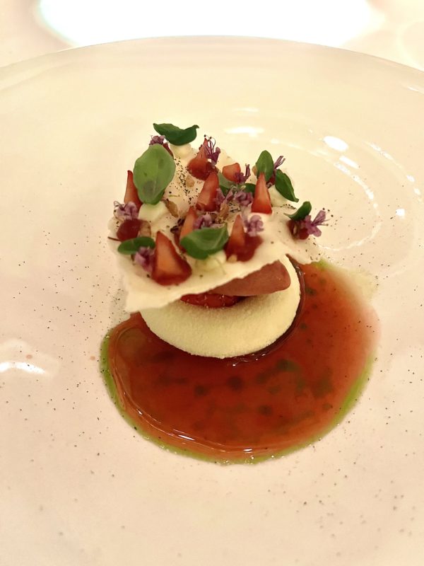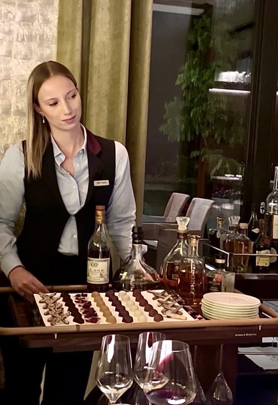 Les desserts — une nèfle accompagnée d’un jus de fruit du cacao, poivre yuzu et shiso, puis une fraise avec chocolat blanc, amazake, basilic et citron — prolongent cette même logique de maîtrise absolue : frais, précis, légers sans jamais être anodins. Ici, le chef ne cède pas à l’effet facile et son parti pris paie car c’est souvent là que les grandes tables vacillent. Mais ce n’est pas tout, car au moment où l’on croit le repas achevé, arrive un second temps fort avec un immense chariot de chocolats. Une conclusion attendue, peut-être, mais qui fait toujours un grand plaisir et qui a tout son sens dans une ville comme Zurich, indissociable de l’histoire du chocolat.