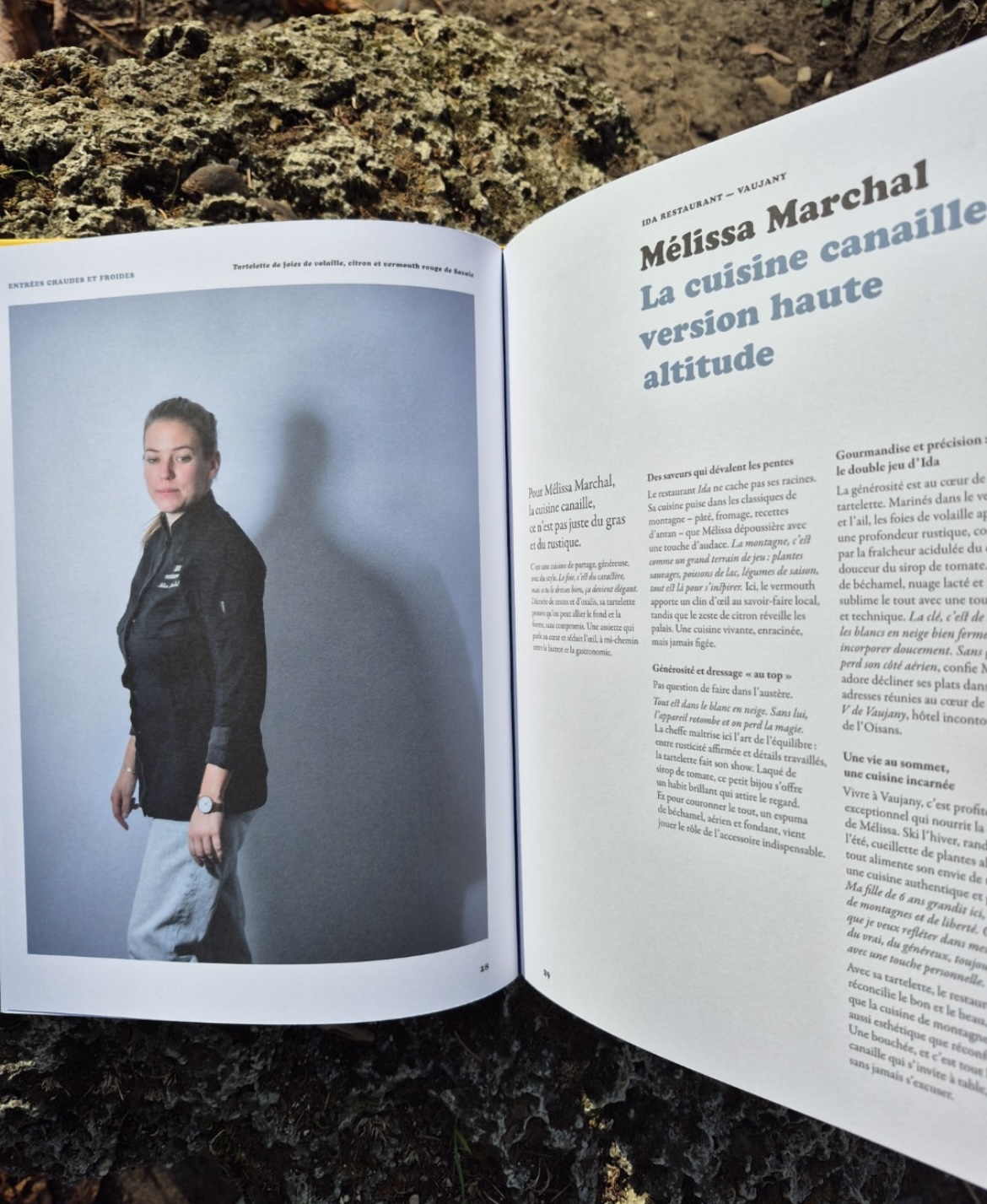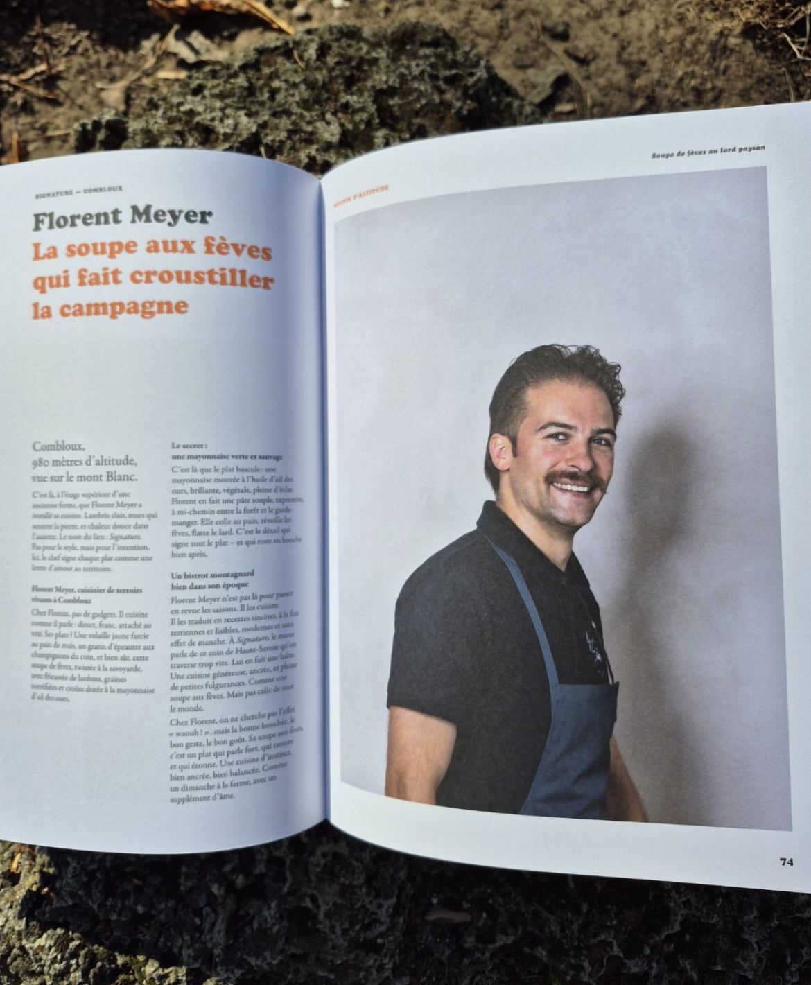 LES RECETTES – 39 recettes traditionnelles, iconiques – issues du conservatoire des recettes de montagne – customisées par 39 jeunes chefs de moins de 39 ans. Oui, aucun des chefs «casté» ne dépasse les 39 ans : «Ma curiosité s’orientait vers ce rapport à la cuisine de territoire et mon rôle était de repérer ces tables-là, qui font d’un produit local quelque chose de “vraiment bien”, explique l’auteur. La sélection était assez logique. Cette cuisine de montagne, si tu la fais par prétexte, tu n’as pas ta place dans ce livre. Ceux qui y sont, ils ont chevillé au corps une âme d’aubergiste, ils respirent leur cuisine. C’est un livre patrimonial.» Ainsi s’écrit une cuisine de montagne mêlant tradition modernité et accessibilité, cueillette sauvage, pêche et chasse. La cuisine de montagne, la soupe brûlante qui fume dans l’assiette, le fromage coupé à l’opinel… Chaque recette est suivie d’un portrait du chef