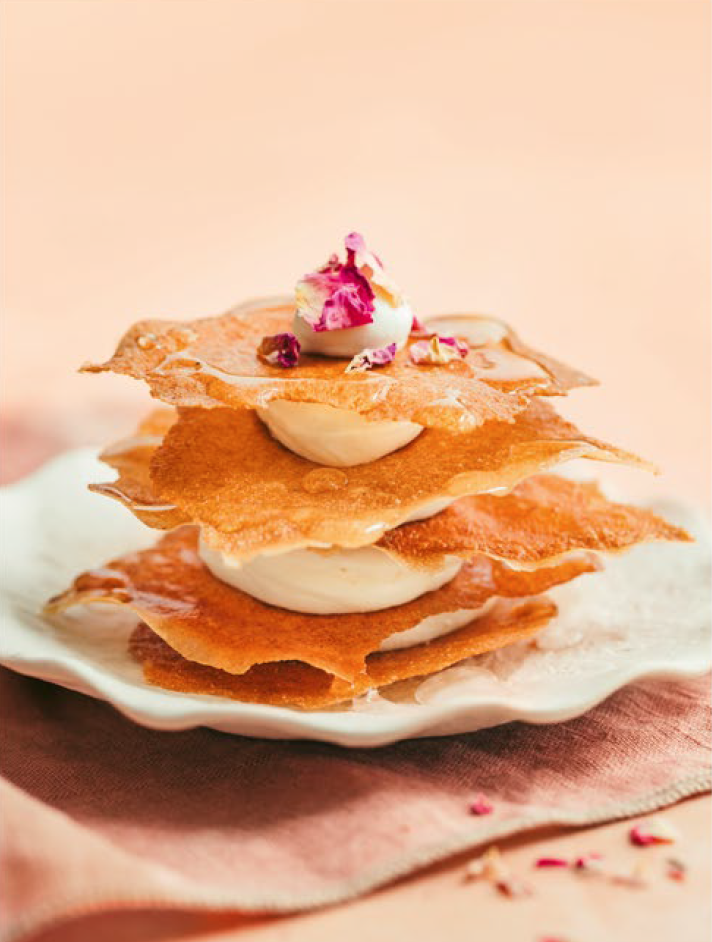 Desserts & boissons – Crème brûlée au safran – Pastilla au lait et à la fleur d’oranger – Affogato, glace vanille, café belli aux épices – Crêpes mille trous façon Suzette – Brioche perdue, crème fouettée, amlou – Citronnade à la fleur d’oranger