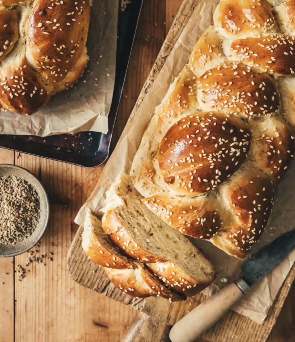 Krachel, brioche tressée à l’anis – Focaccia au Zaatar – Harchas au thym et aux olives noires