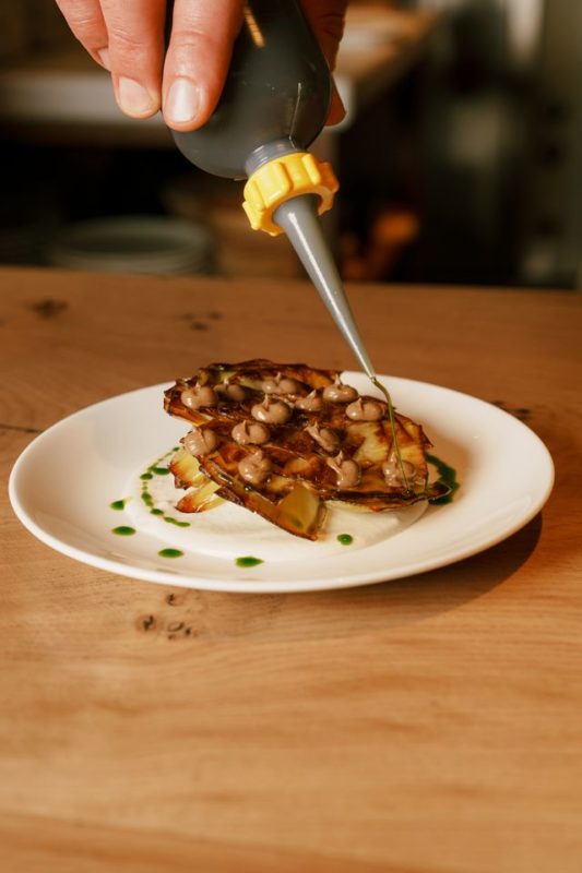 Les riz suivent, qui donnent à voir des plats de régions plus rurales ; puis la poitrine de porc, généreuse, entêtante, retient la fourchette et la fait revenir. Au tour des côtelettes d’agneau, servies façon milanaise ; elles sont d’une grande justesse, nappées de câpres et d’olives – et d’originalité. C’est pourtant le légume qu’on retiendra le plus : un artichaut grillé et sa sauce amande, dont la perfection sensible s’inscrit durablement dans notre mémoire gourmande.