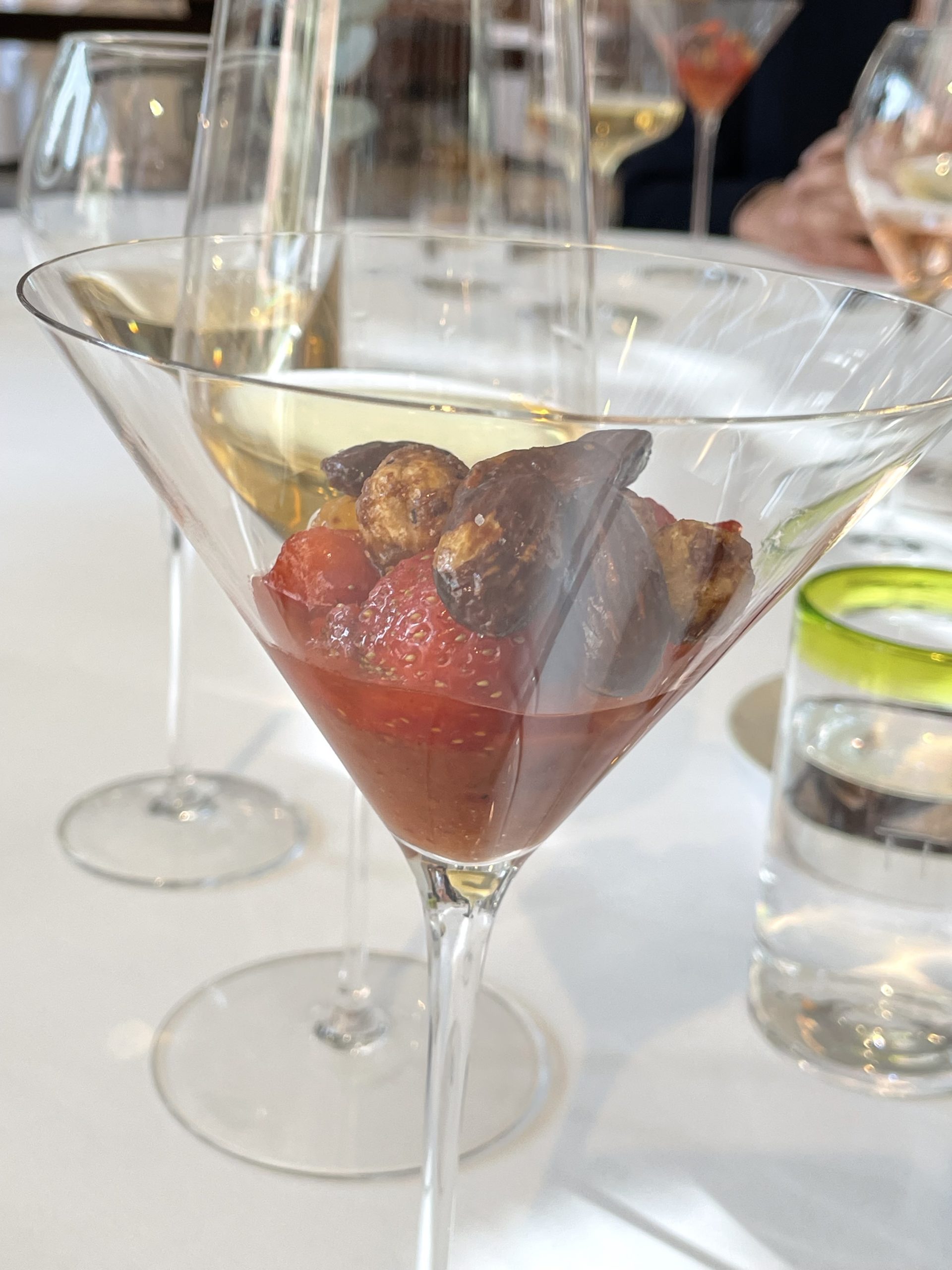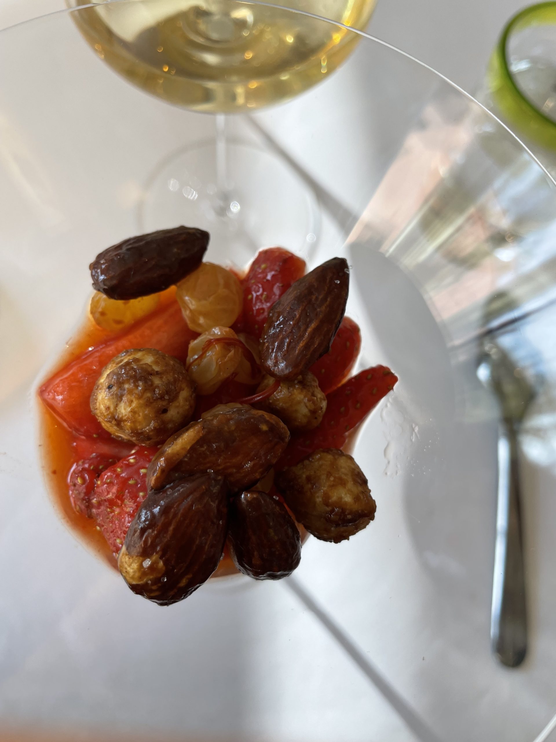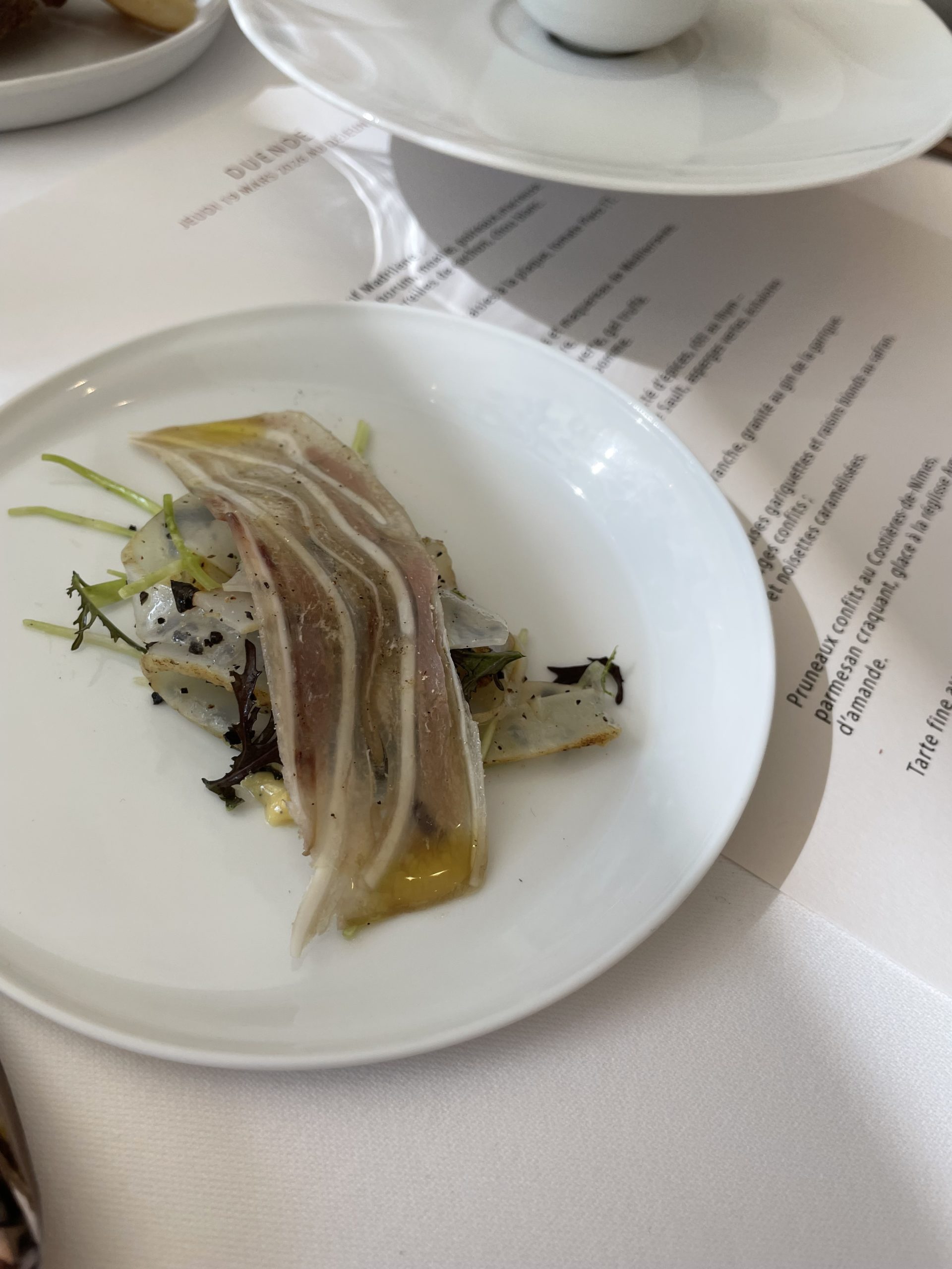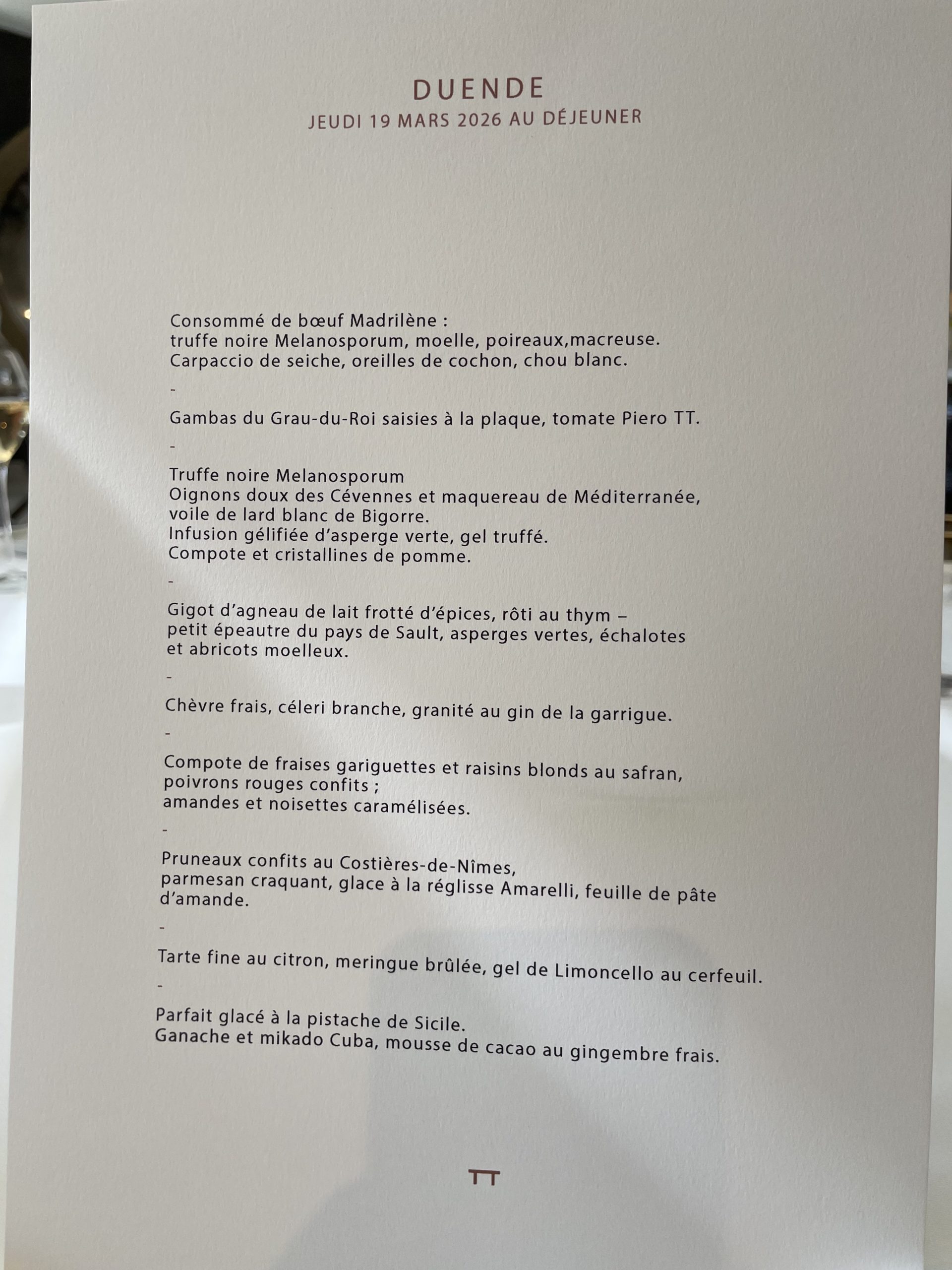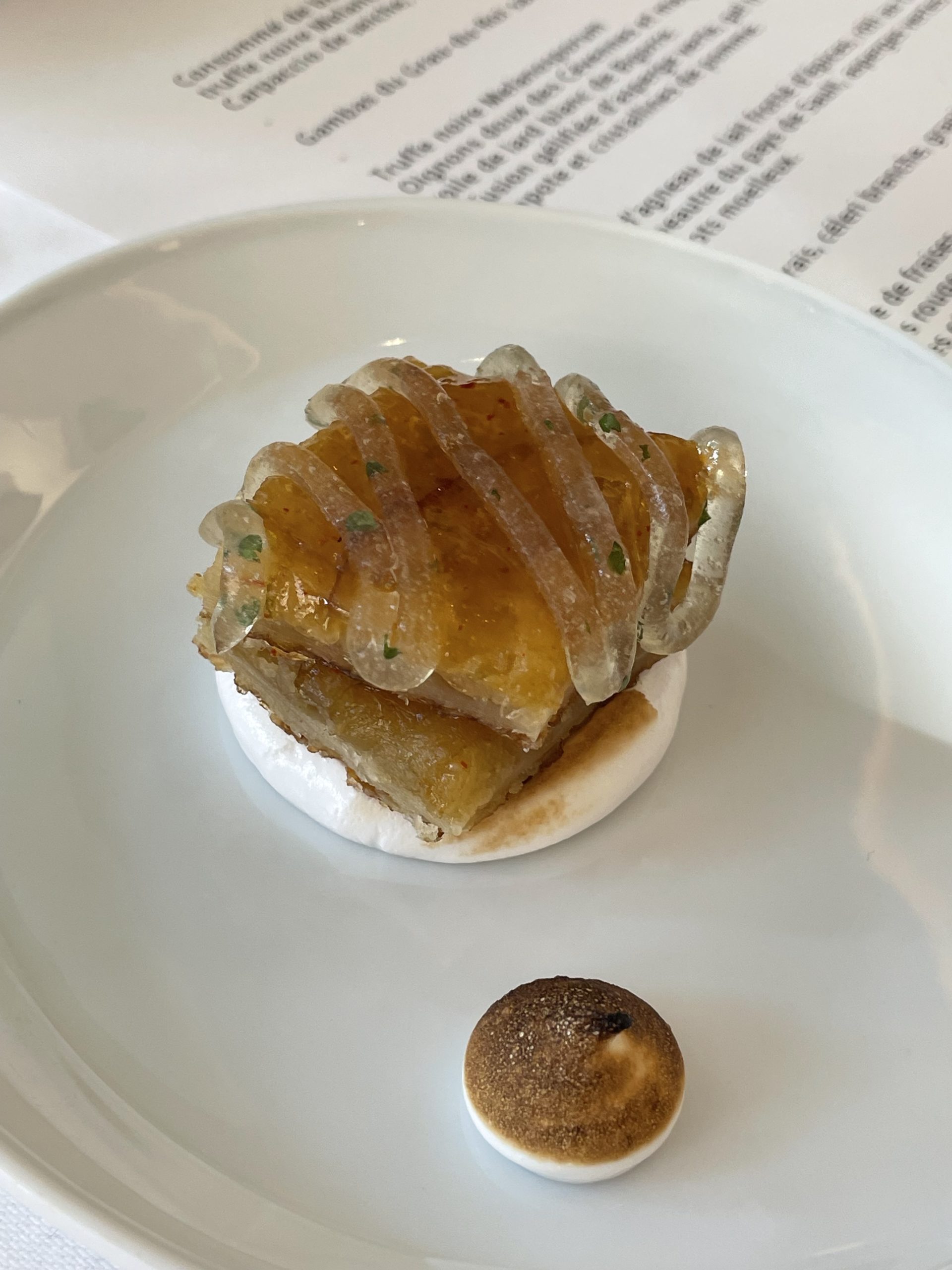 Pas de “plat à la truffe », non, nous avons vu défiler royalement des variations de travail et d’accords où la truffe se fait puissante ou douce, fragile ou forte, très présente ou plus discrète, met en avant ses subtilités terriennes, nous enchante ou nous déroute, mais toujours là, elle va et vient au coeur des plats, toujours différente. Elle pose son empreinte et réveille des sensations tout au long des audaces d’accords, des mariages terre et mer entre des produits fortement ancrés dans le terroir local, qui s’épanouissent dans le travail des textures, gel, bouillon, infusion, granité, compote.