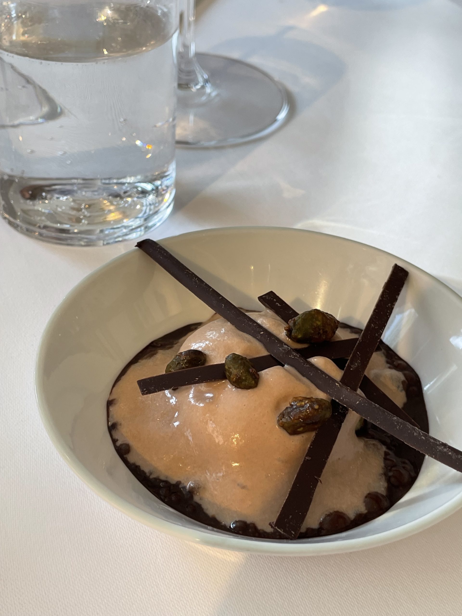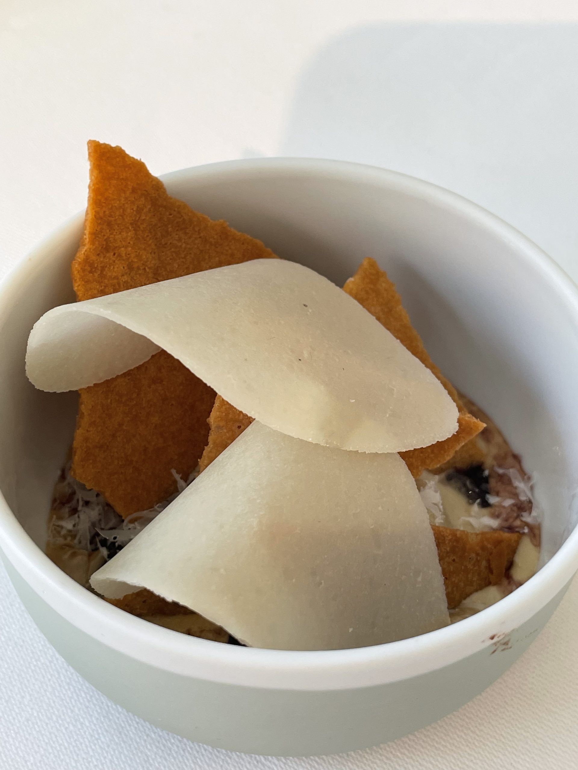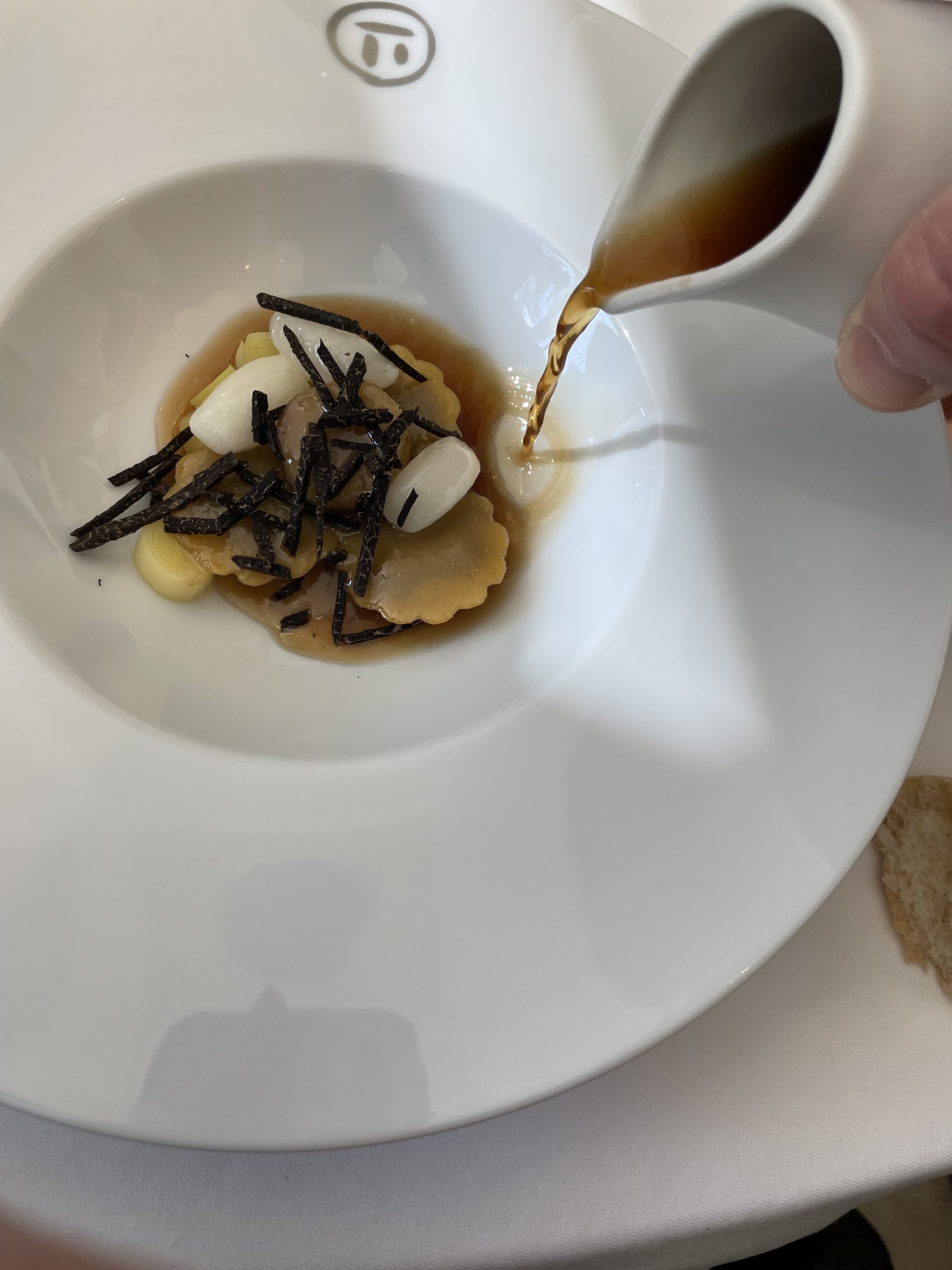 Cette première assiette diffuse son parfum, elle siège mise en scène par Pierre Gagnaire entre douceur et force, délicatesse et présence assumée. La truffe s’épanouit dans le bouillon, le consommé