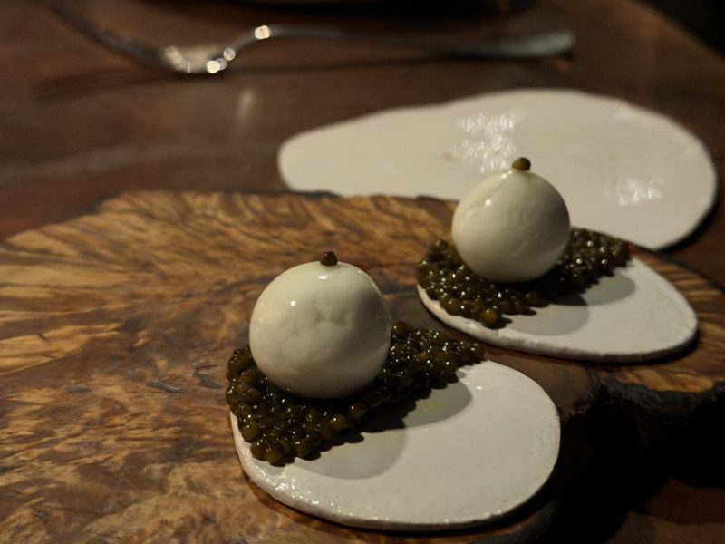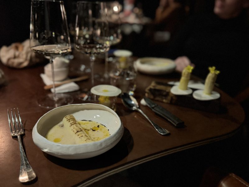 Asperge blanche d’Hautefeuille, .bouillon fermenté, .tête en allumette, .colza en salade…