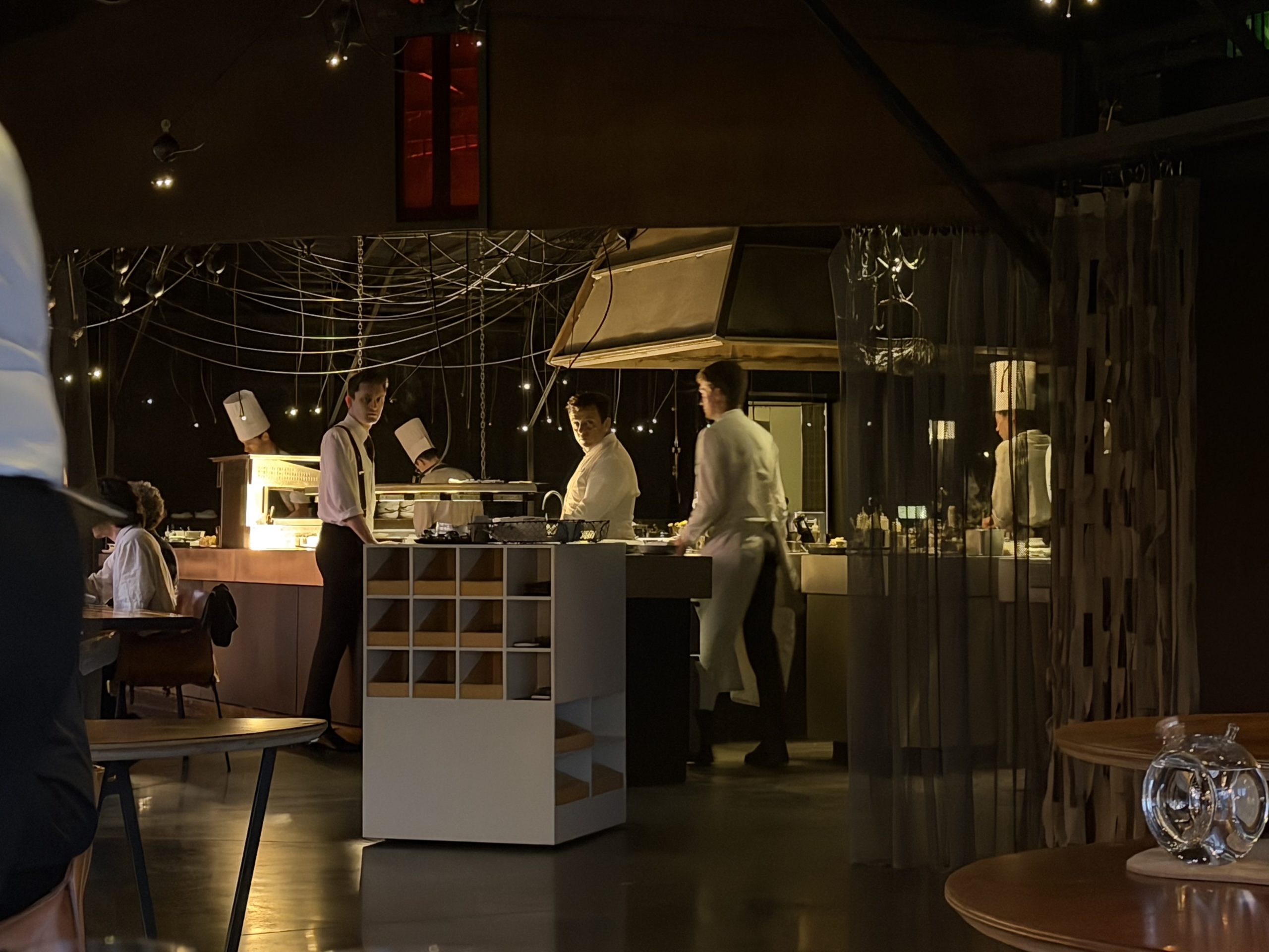 L’architecture signée Patrick Bouchain, un mélange entre bâti ancien et structure contemporaine audacieuse, quelque part entre le chapiteau et la maison de famille n’est pas un décor. C’est une intention. Il a fallu des années à Gauthier pour trouver la cohérence entre ce qu’il cuisinait et ce que la maison racontait. « Il y avait au commencement un décalage », reconnaît-il avec la franchise de quelqu’un qui n’a plus rien à prouver. « J’avais la cuisine, mon style, mais la place ne me ressemblait pas encore. » Aujourd’hui la cohérence est totale : tables en cuir organique tatouées, pas de nappe, les assiettes volontairement désaxées, autant de choix qu’il pose depuis vingt-trois ans pierre après pierre et que l’on retrouve désormais partout ailleurs, souvent sans savoir d’où cela vient.