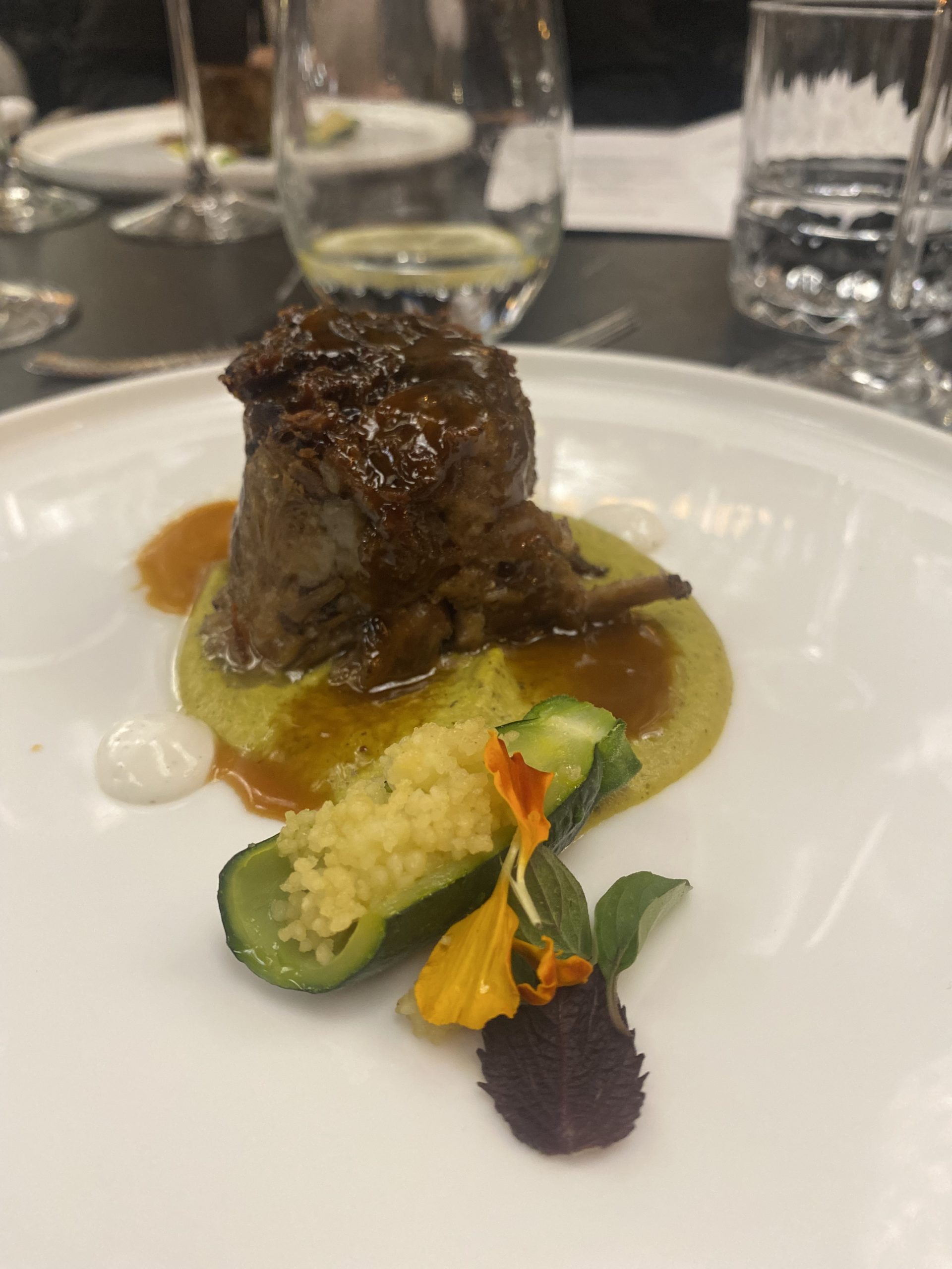 Terrine de cou d’agneau avec purée de courgettes épicée, courgettes farcies au couscous, yaourt et sauce à l’agneau avec Maria Lluïsa Elisabet Nolla · Restaurant Normal Girona, Espanya