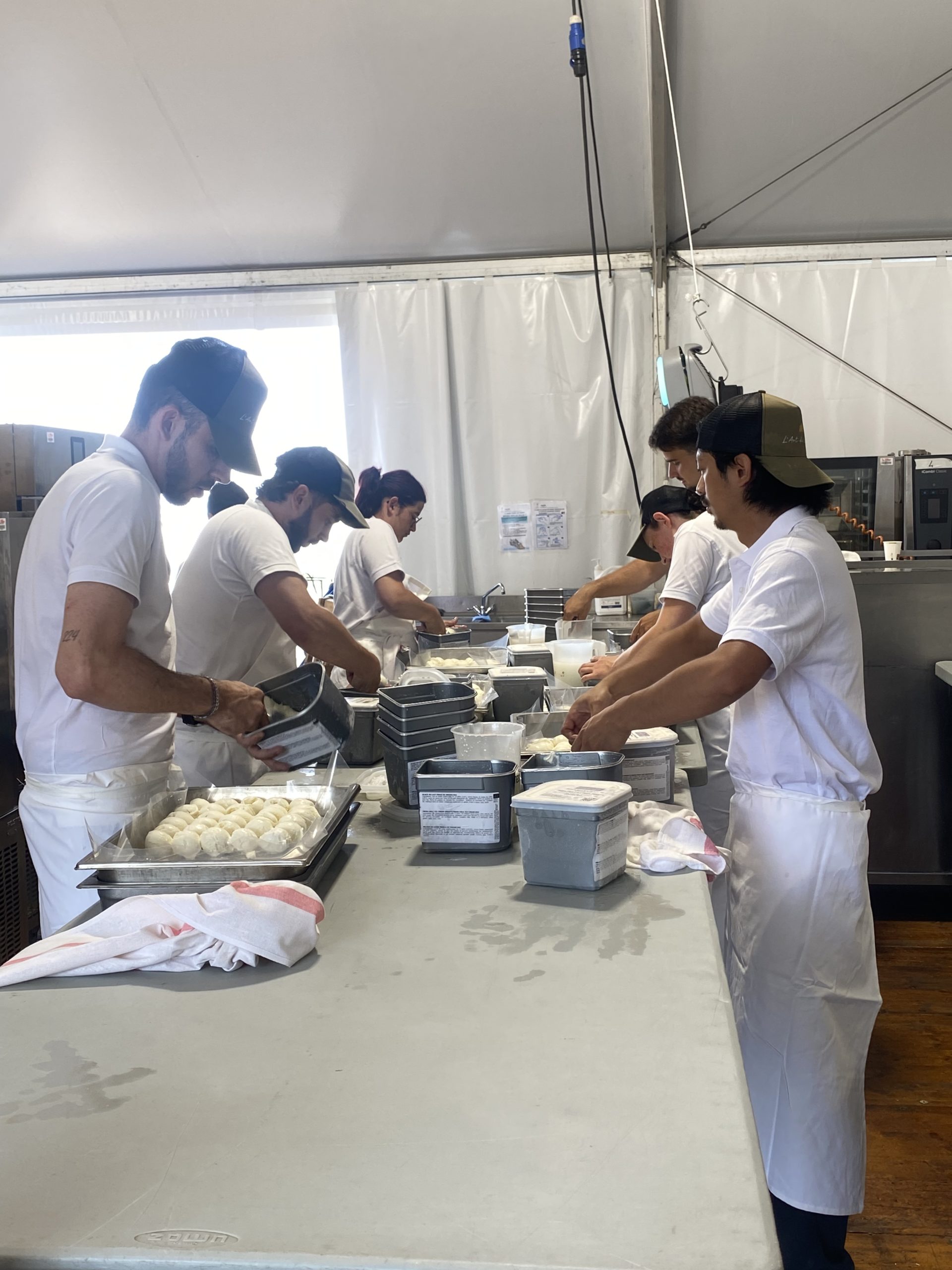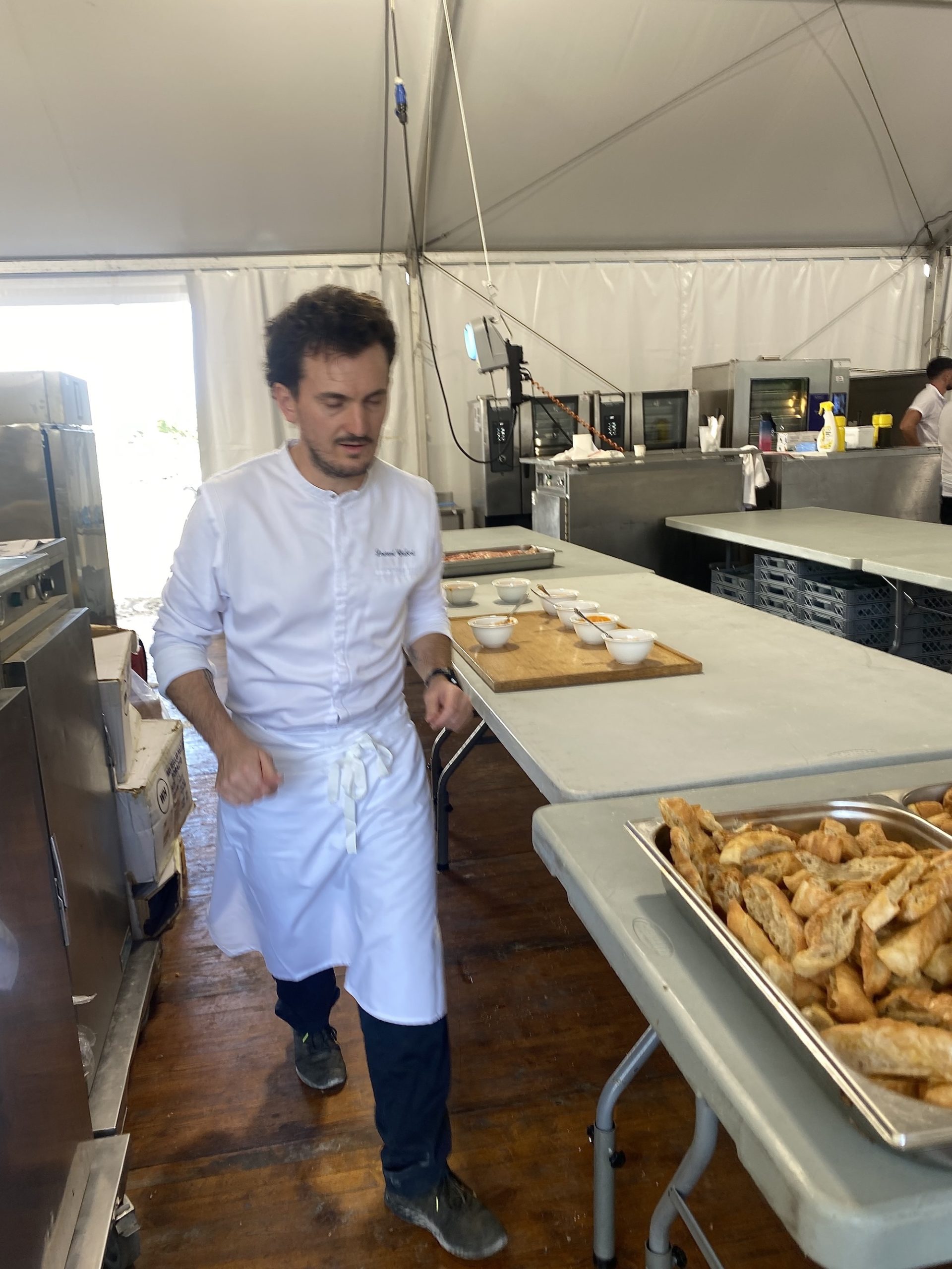 “Nous sommes avec Ariane Gorry ma seconde 10 cuisiniers à travailler de concert. En cuisine nous sommes 48 au total, des stagiaires, des pro, des bénévoles aussi venus donner un coup de main pour ces soirées exceptionnelles, c’est une très jolie ambiance sérieuse et amicale…” Des tentes montées pour l’occasion abritent 500m2 de cuisine avec chambres froides, et toutes les sections règlementaires, comme dans une cuisine de restaurant normale. Le service à l’assiette demande rigueur et discipline , tant dans le travail du chef que dans le service à table, assuré par 50 serveurs, qui se doit d’être minuté pour des mets servis à température. Ce qui a été le cas tout au long du diner de gala.
