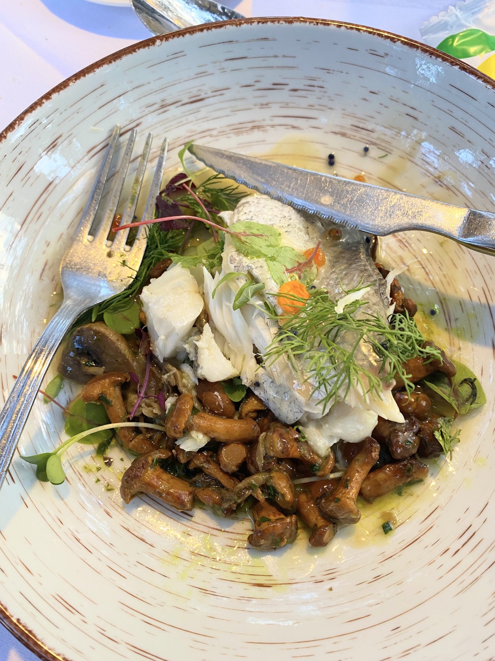 S’en est suivi le dos de merlu cuit à basse température, beurre blanc aux oeufs de poisson, poêlée de girolles de Haute Loire et pleurotes que l’on a associé avec un chardonnay Domaine de l’Aigle, AOP Limoux 2023. Un poisson à la cuisson parfaite et à la température nécessaire pour mettre en valeur cette assiette gourmande …servie au passage en 1500 exemplaires !