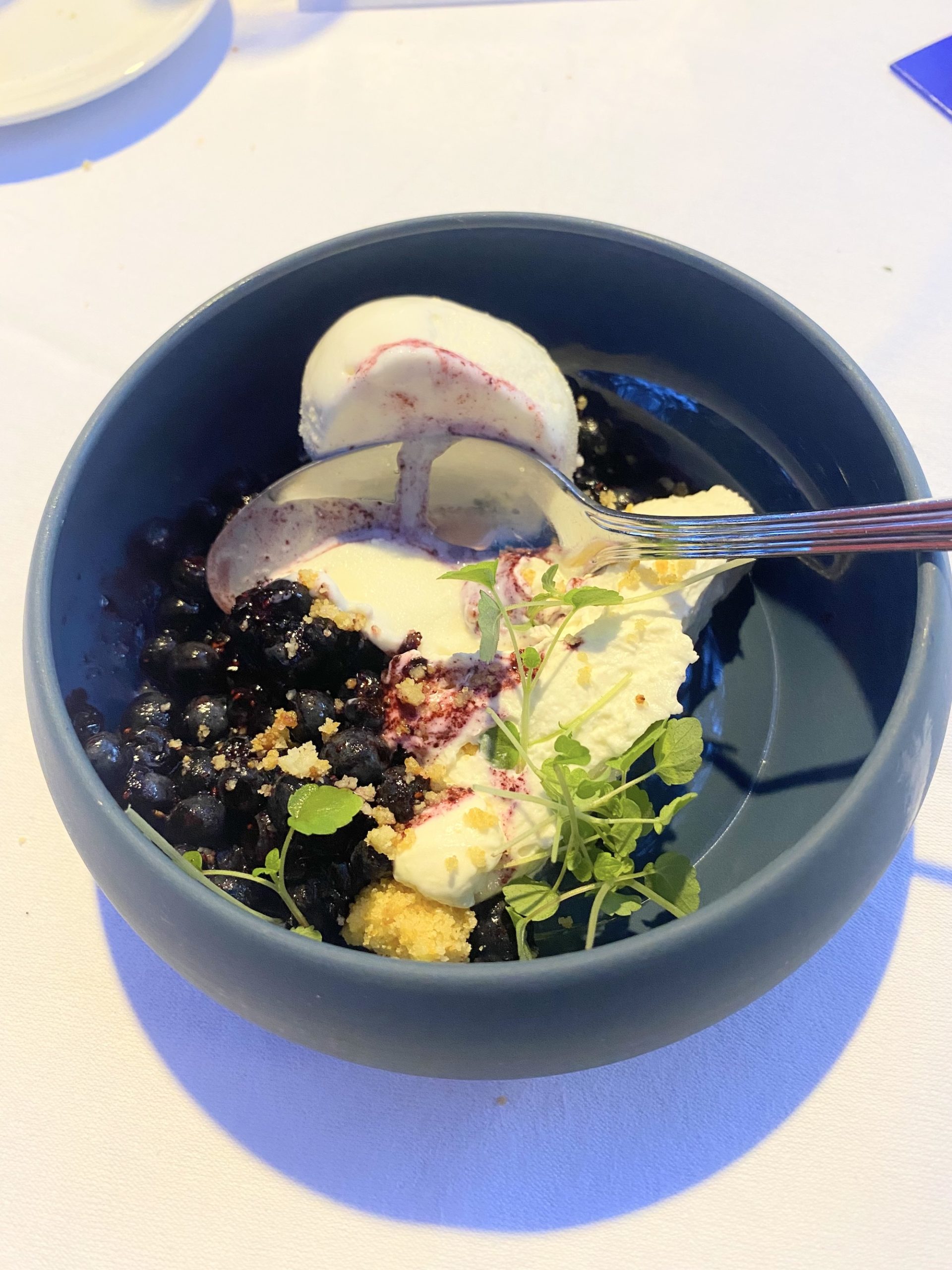 Très beau plateau de fromage de la maison Betty à Toulouse dégusté avec le grand vin rouge Château l’hospitalité AOP la Clape 2022. En dessert, Myrtilles sauvages, crème d’Anjou au chèvre de Combebelle, croustillant à la fleur de sel de Gruissan en accord parfait avec le Banyuls Gérard Bertrand AOP Banyuls 2018.