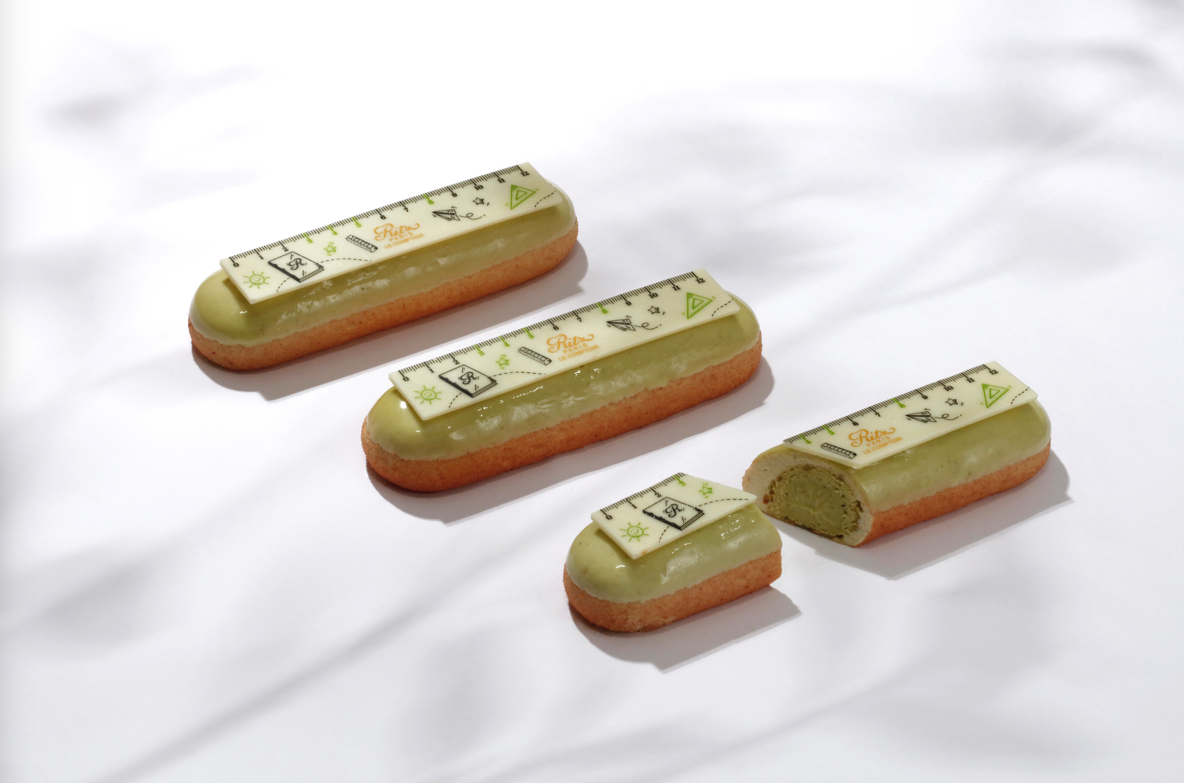 Voilà un Entremets Eclair Pistache décoré d’une règle en chocolat. Une nouvelle création en trompe l’œil, signature des boutiques Ritz Paris Le Comptoir. Un biscuit pâte à chou révèle une mousse légère à la pistache et un crémeux pistache, le tout nappé d’un glaçage pistache et décoré d’une règle en chocolat.Ludique, délicieux, sans commune mesure !