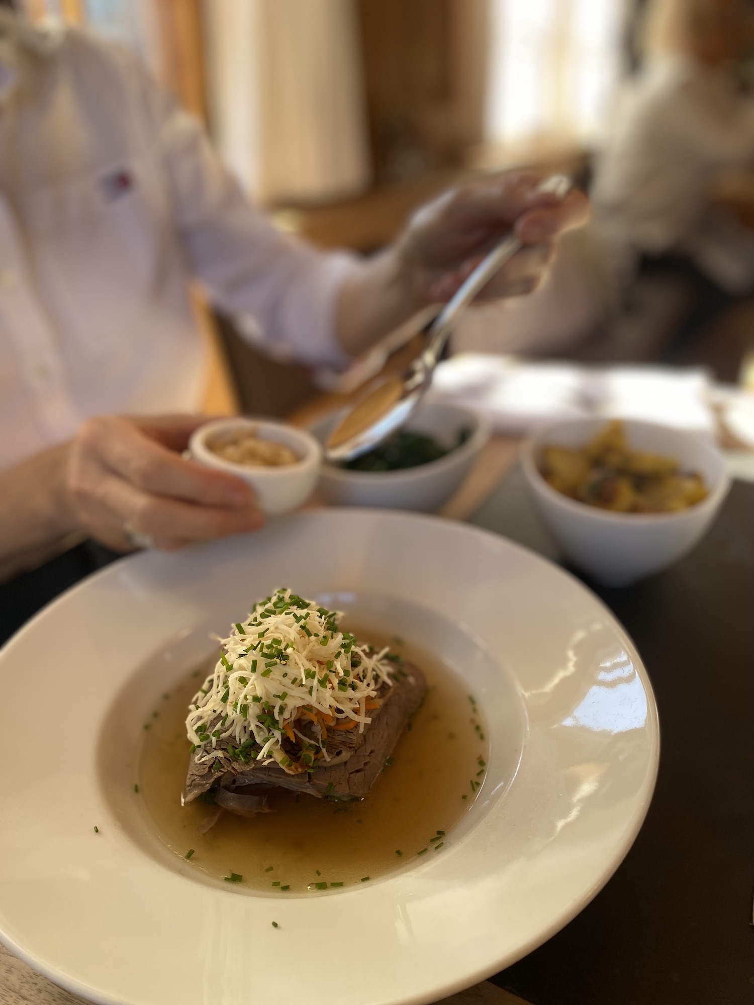 Après un parcours exigeant, deux toques, un passage dans un trois-étoiles à Vienne, puis à Lech, station de ski autrichienne chic , le chef a fait le choix, avec son frère Florian, de revenir à une gastronomie plus familiale, sans chichi, loin du très gastronomique que proposait autrefois la maison. Ici, place aux produits autrichiens, au gibier sauvage, aux poissons et viandes soigneusement sélectionnés. La qualité prime, sans compromis, mais toujours au service d’une cuisine que les gens aiment et comprennent.