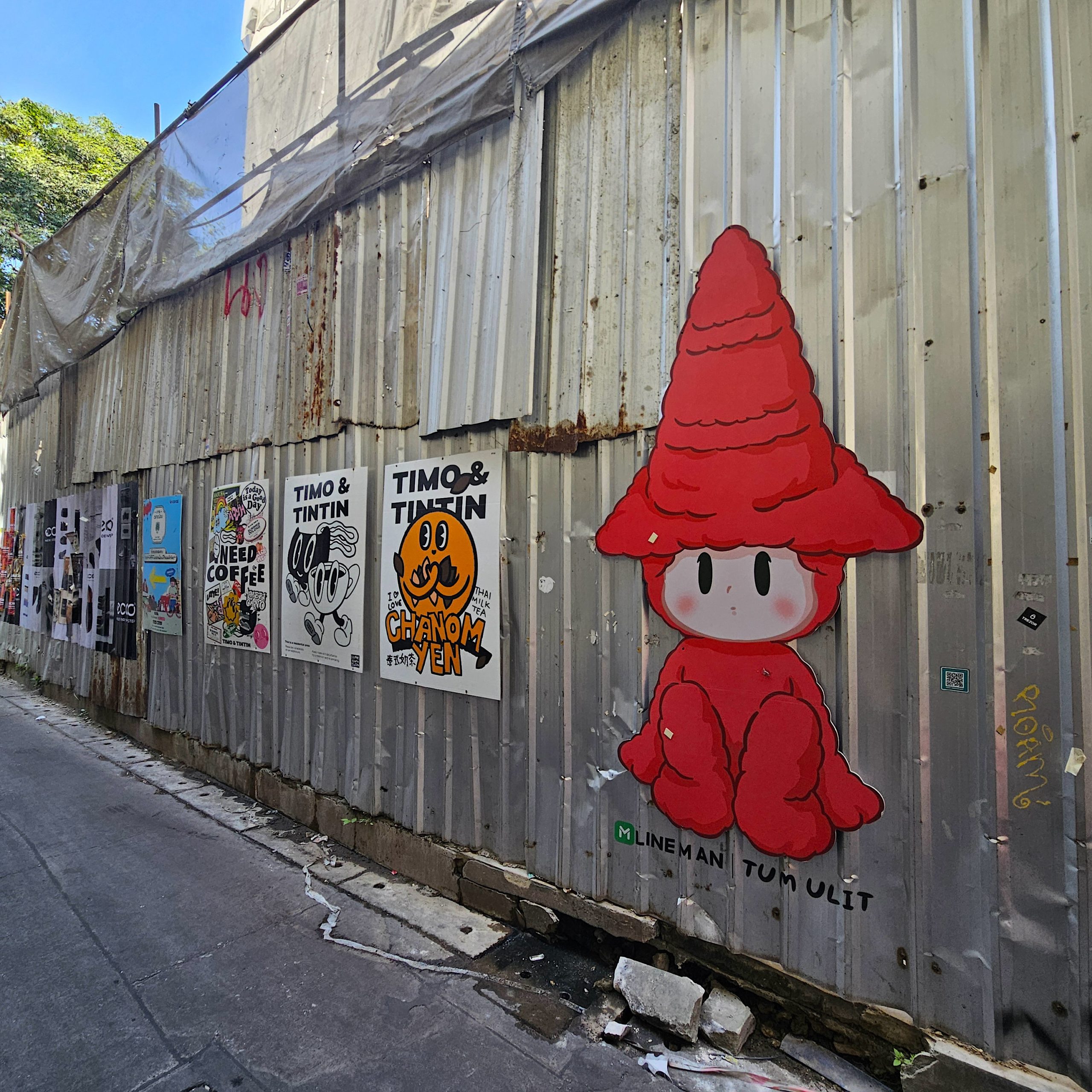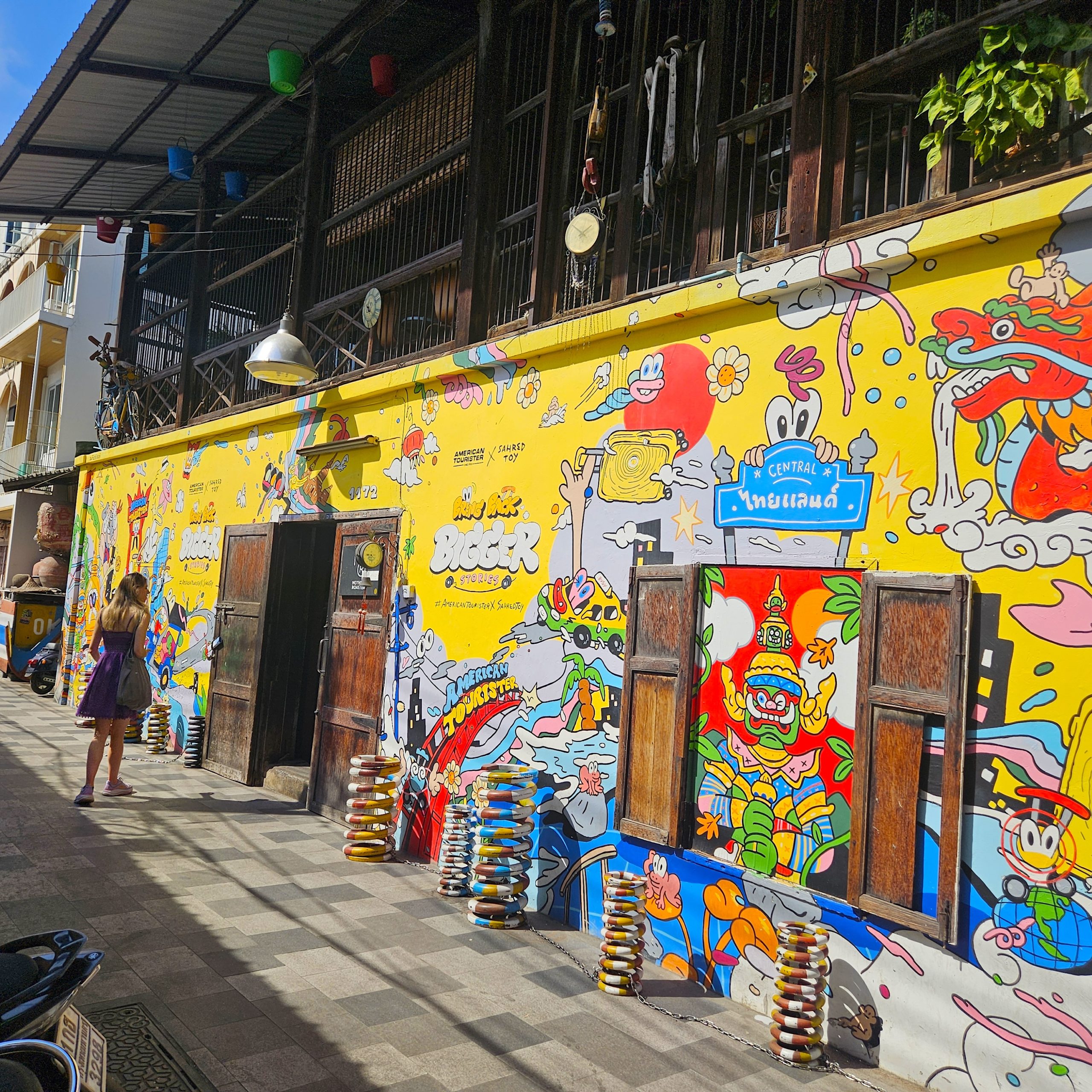 À quelques minutes à pied, Talad Noi déploie un décor d’ateliers mécaniques, de façades patinées et de maisons sino-thaïes. Les murs y sont devenus supports d’expression. Fresques monumentales, lettrages colorés, portraits hyperréalistes : la rue s’impose comme galerie à ciel ouvert.
