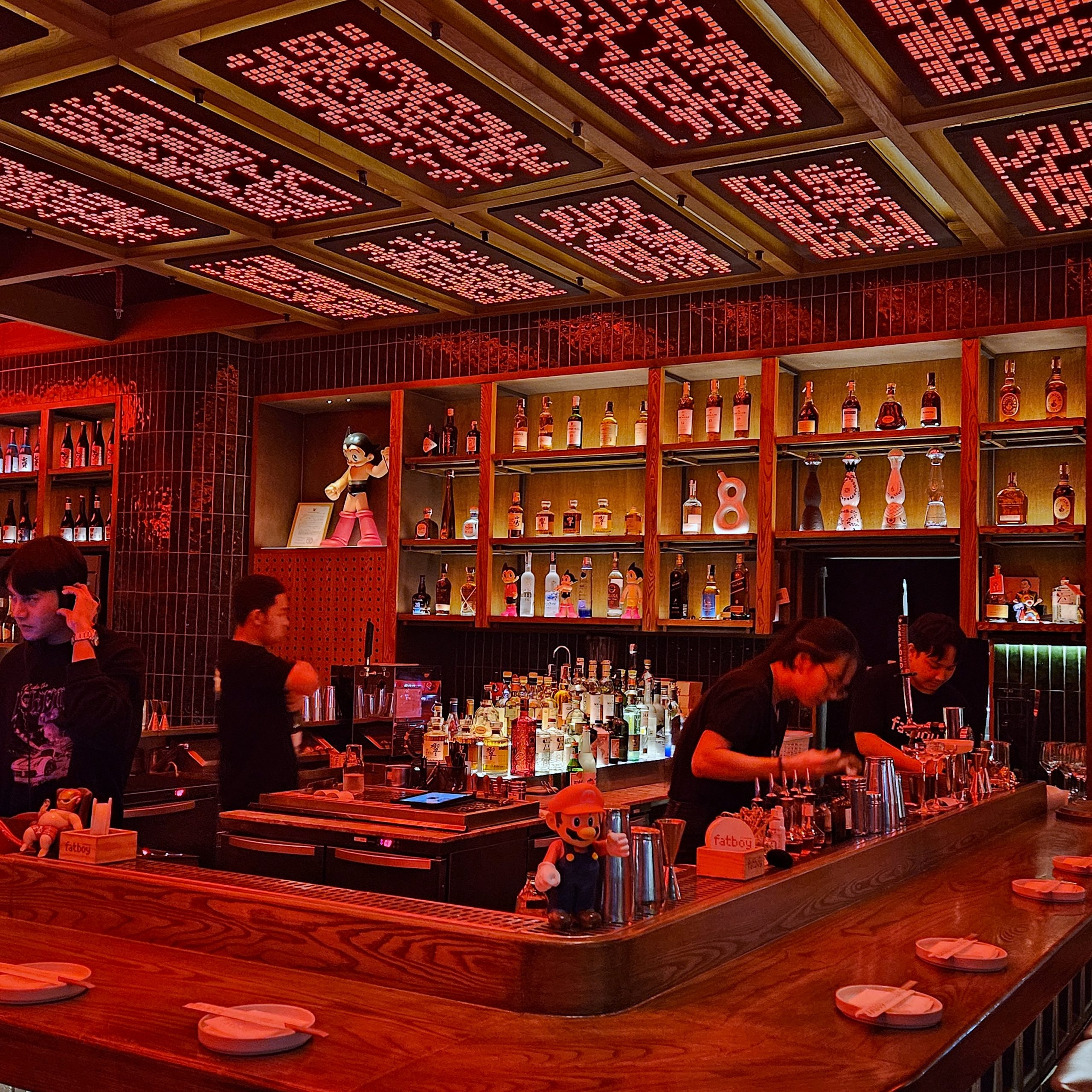 Fatboy est un lieu hybride, reflet d’une ville en mouvement – À l’heure du déjeuner, Fatboy Izakaya joue la carte du casual chic. Le soir venu, il devient un lieu de rendez-vous convivial, avant de glisser vers une atmosphère plus nocturne. Les jeunes gens amateurs de sorties s’y retrouvent dans un esprit cosmopolite.