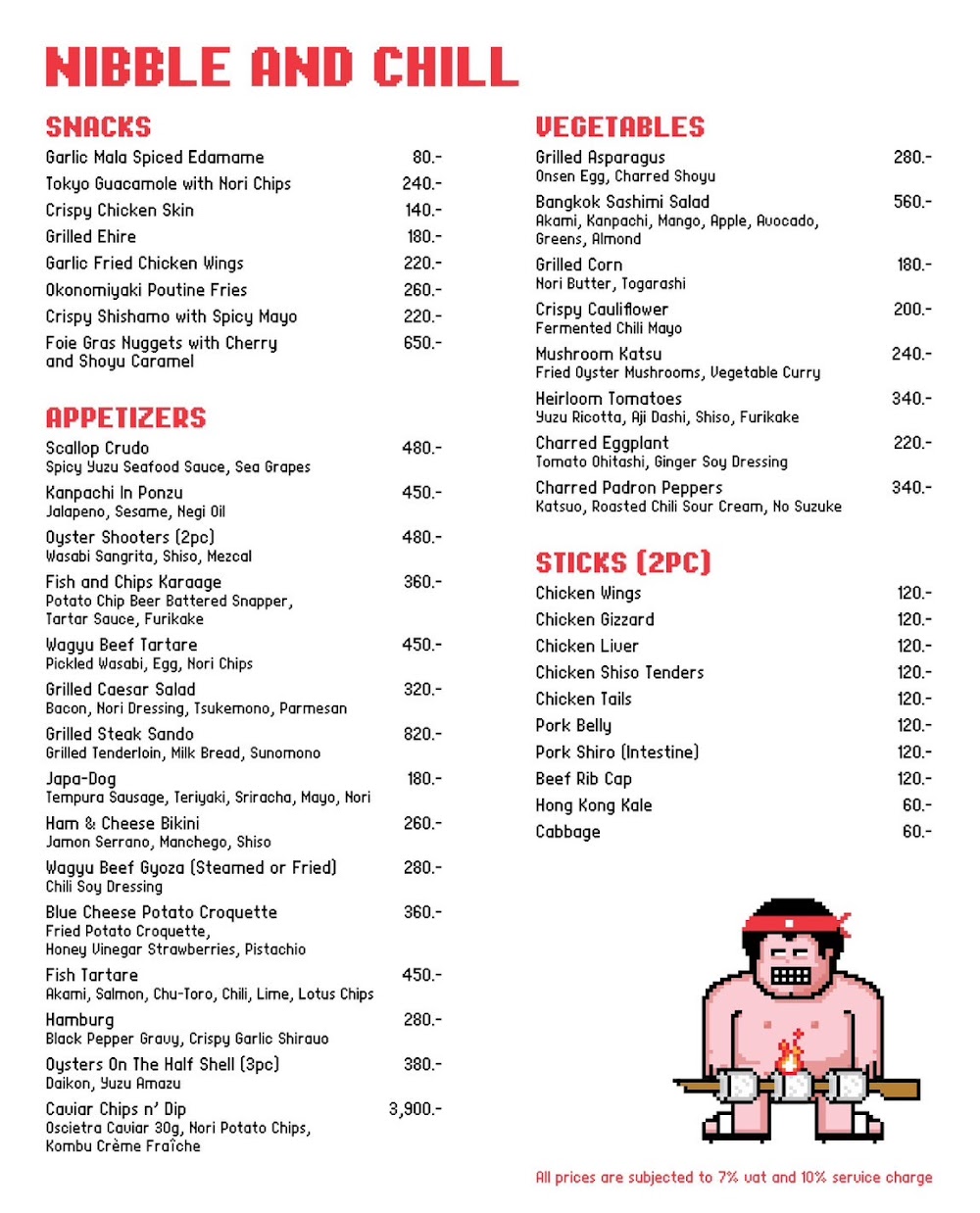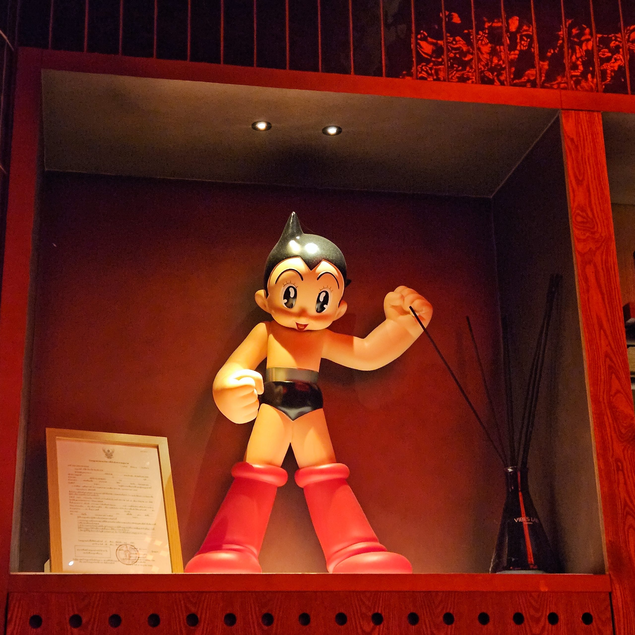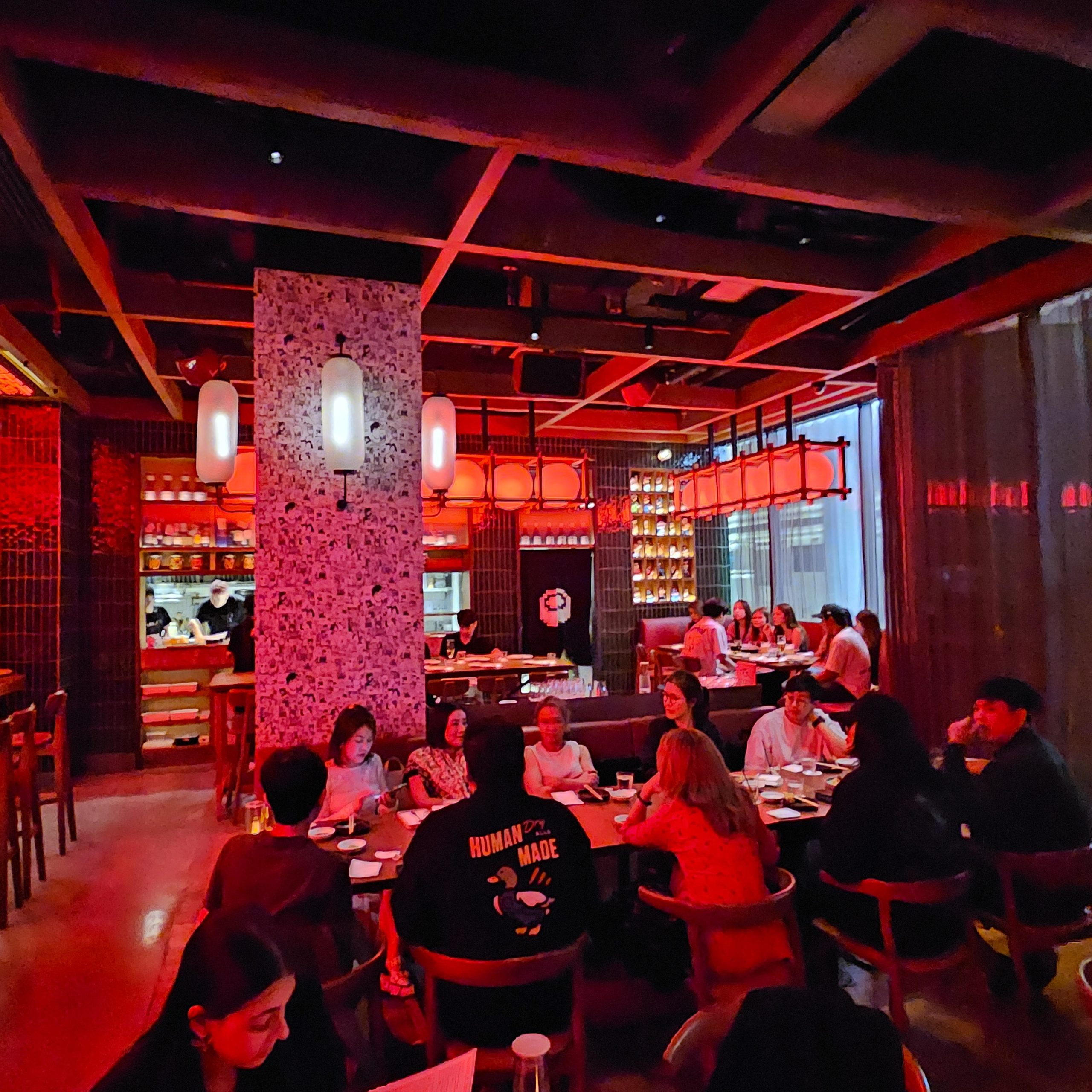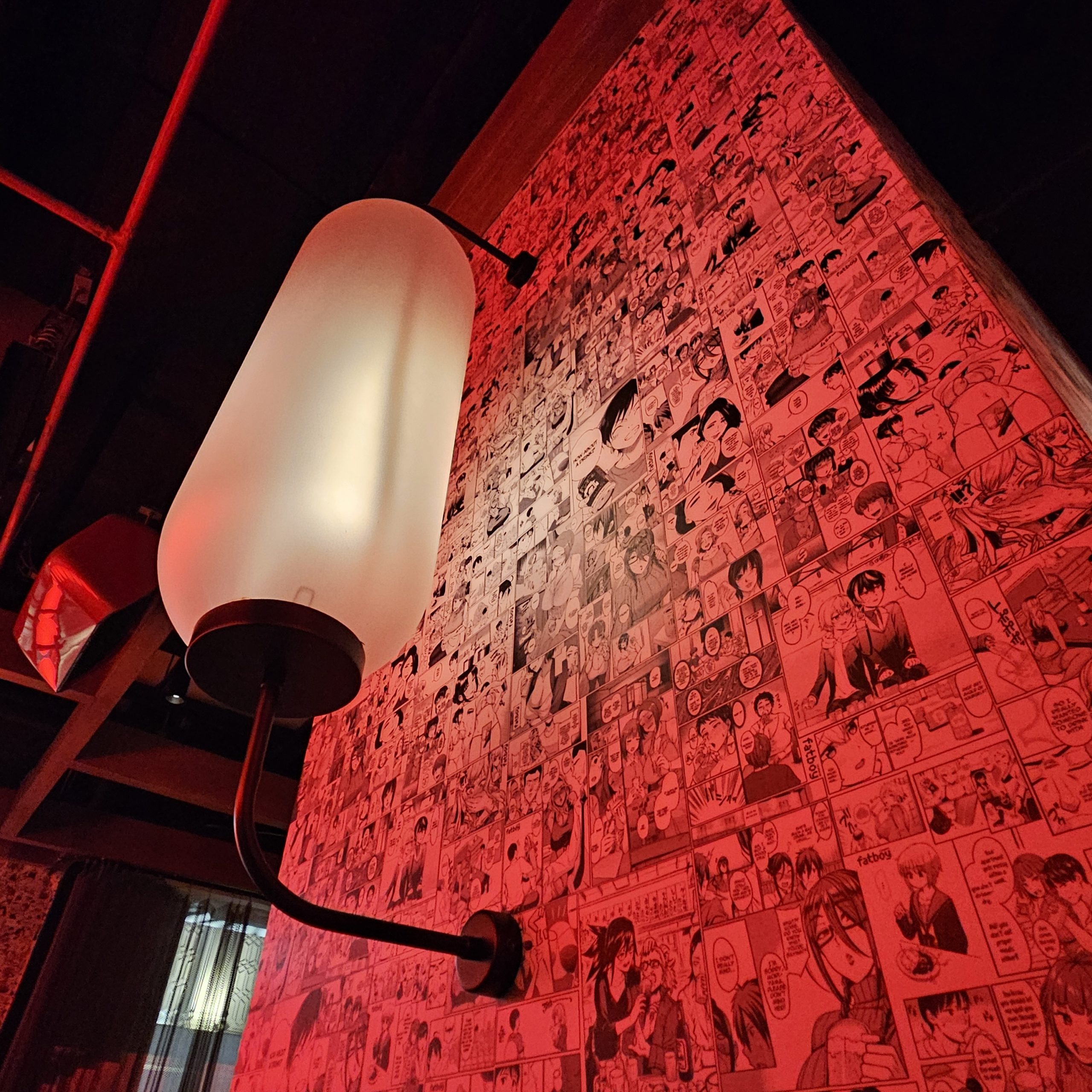 Rendez-vous sur Chidlom pour découvrir une scénographie urbaine aux accents Tokyoïtes – Derrière une façade indiscutablement discrète d’autant plus intégrée dans mall, une fois la porte d’entrée passée, le décor plonge immédiatement le visiteur dans un univers nocturne et immersif. Éclairages néon, bois sombre, textures brutes et références à la pop culture japonaise composent un décor pensé comme une scène vivante. La lumière évolue au fil de la soirée avec une tendance à accentuer le rouge, accompagnant la transition naturelle du dîner vers une atmosphère plus festive.