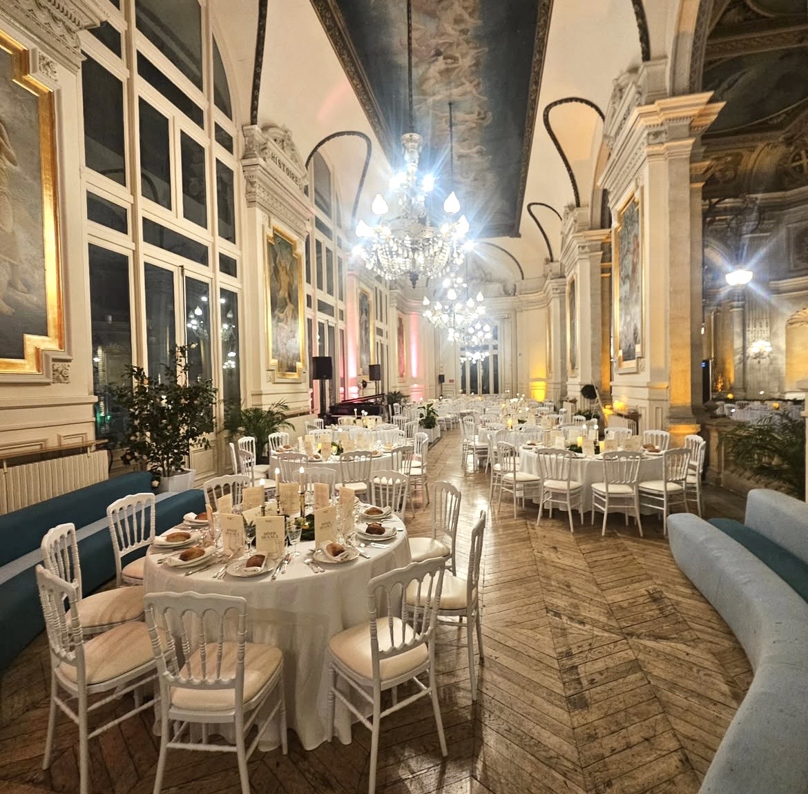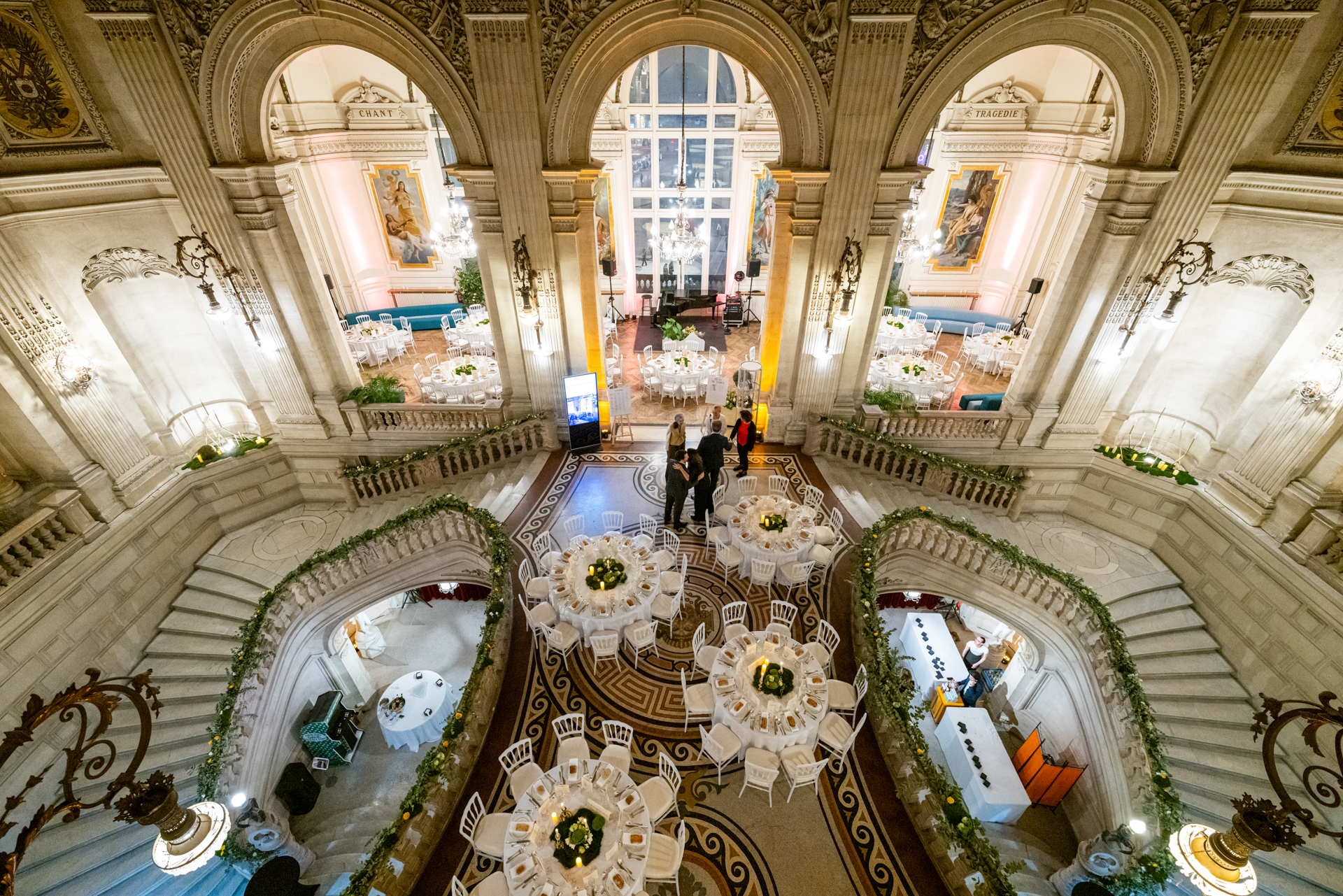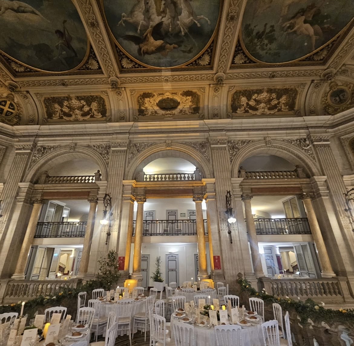 Tout en haut du grand escalier décoré, les tables dressées comme une scène, en majesté vont accueillir tous les convives connus ou inconnus.